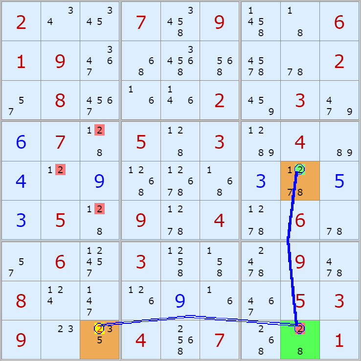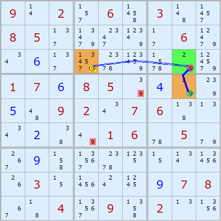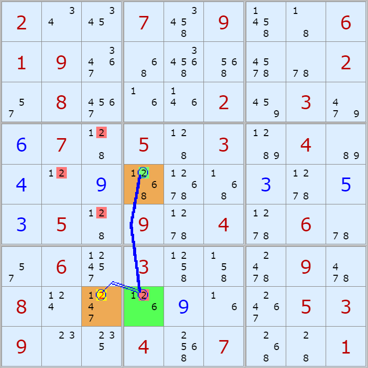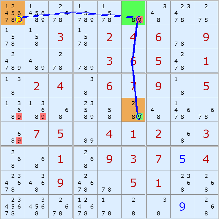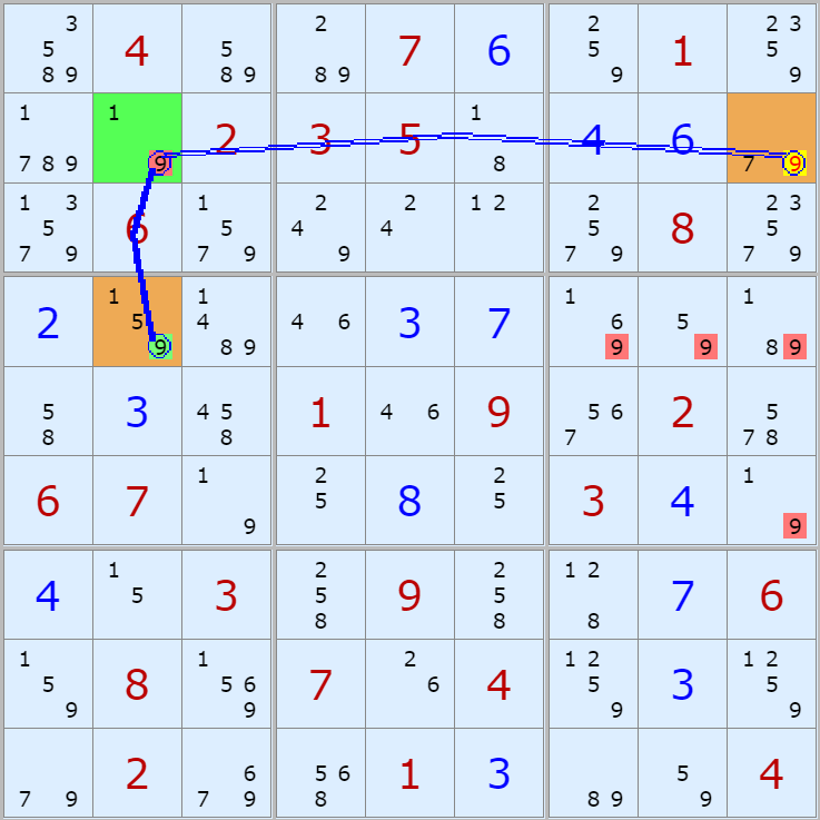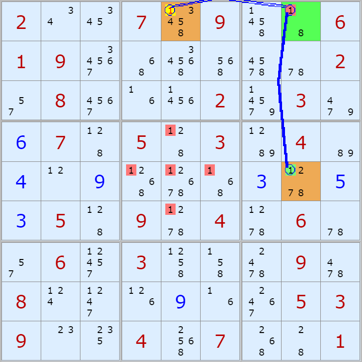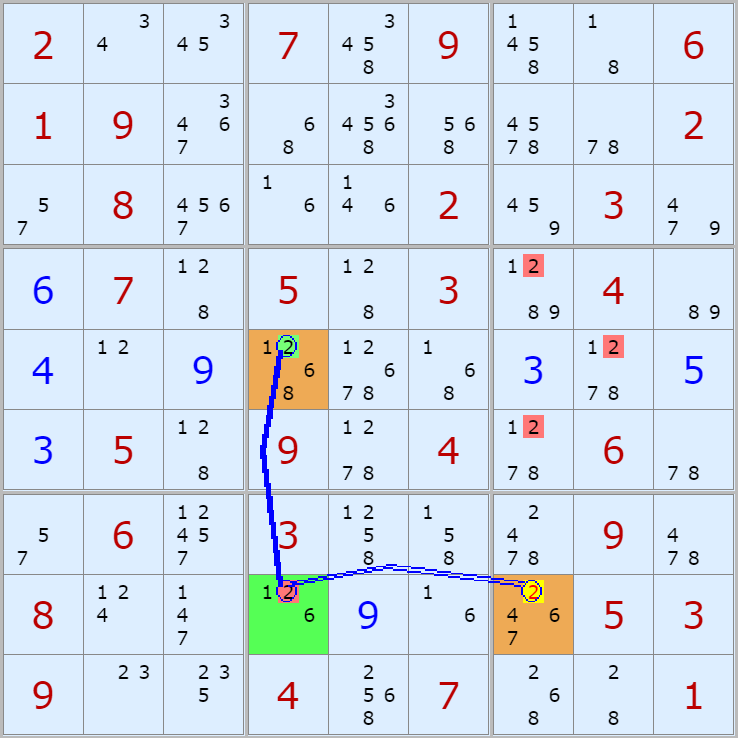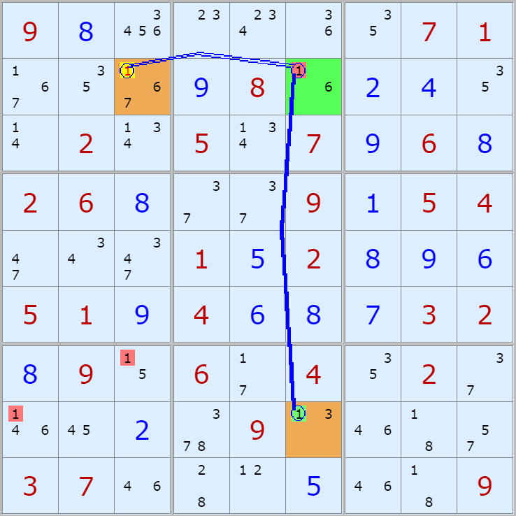 일단 형태는 우리가 잘 알고 있는 Y윙의 형태를 닮았다. 그런데 한 가지 다른 점은 시작점과 끝점이 마주 보는 (1,6)의 후보수9가 아닌 체인의 끝점(1,2)의 후보수 9가 지워진다는 것이다.