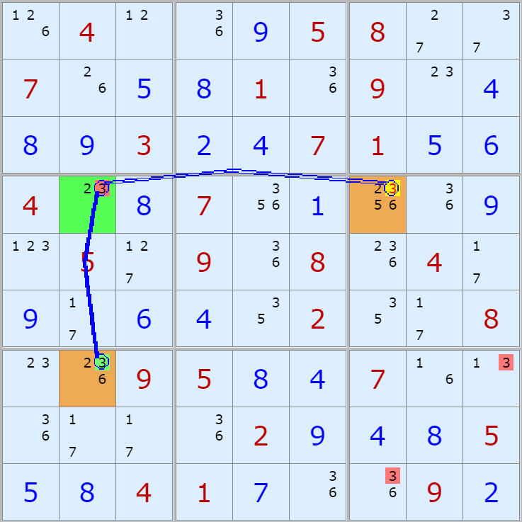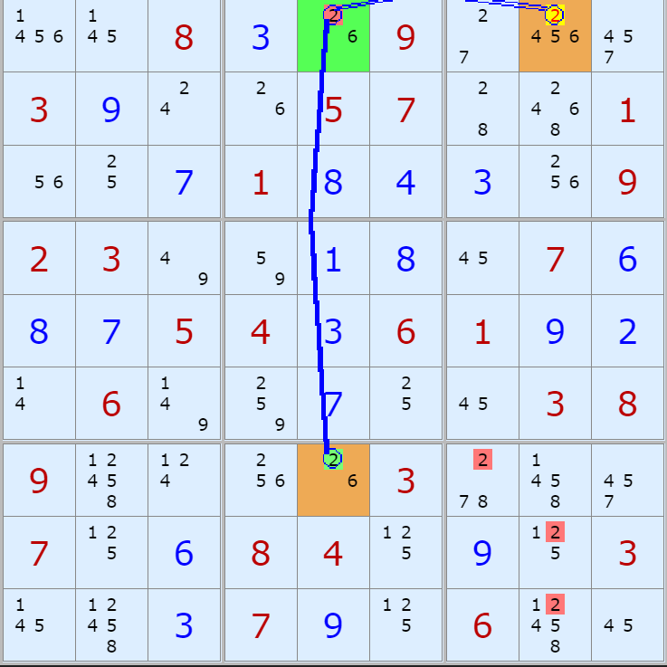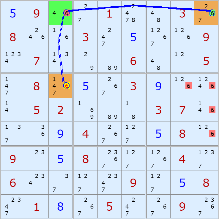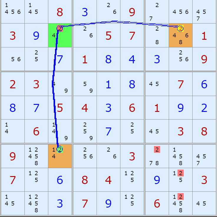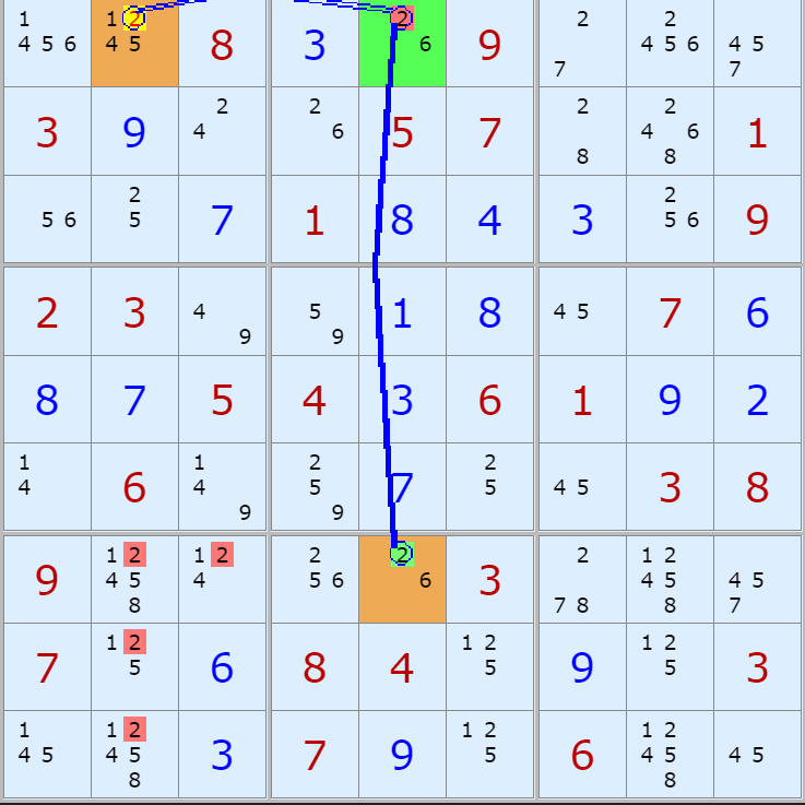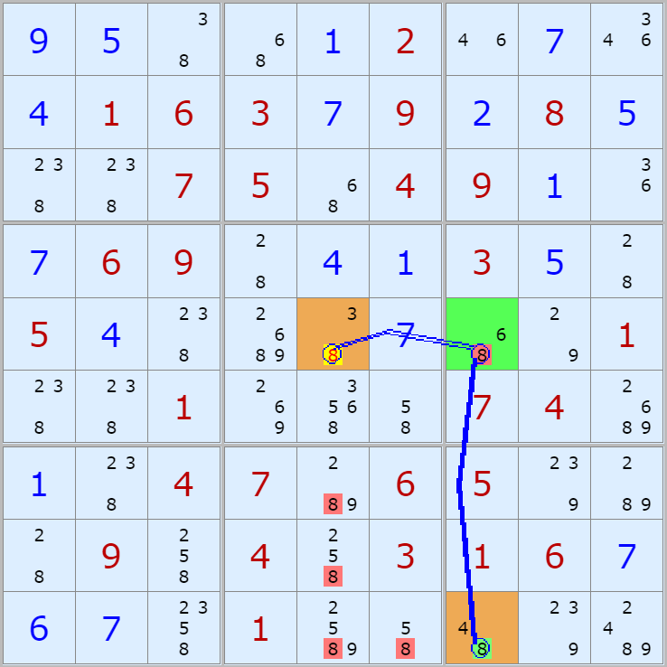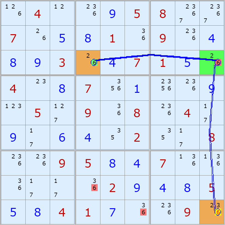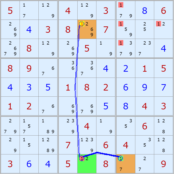 일단 형태는 우리가 잘 알고 있는 Y윙의 형태를 닮았다. 그런데 한 가지 다른 점은 시작점과 끝점이 마주 보는 (1,6)의 후보수9가 아닌 체인의 끝점(1,2)의 후보수 9가 지워진다는 것이다.