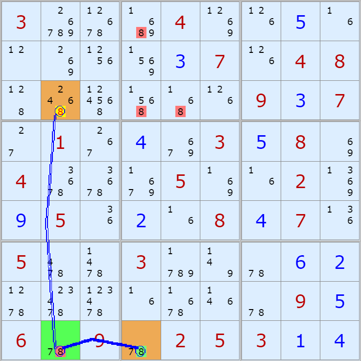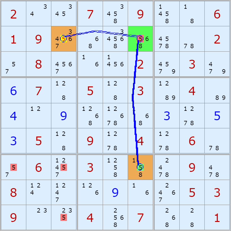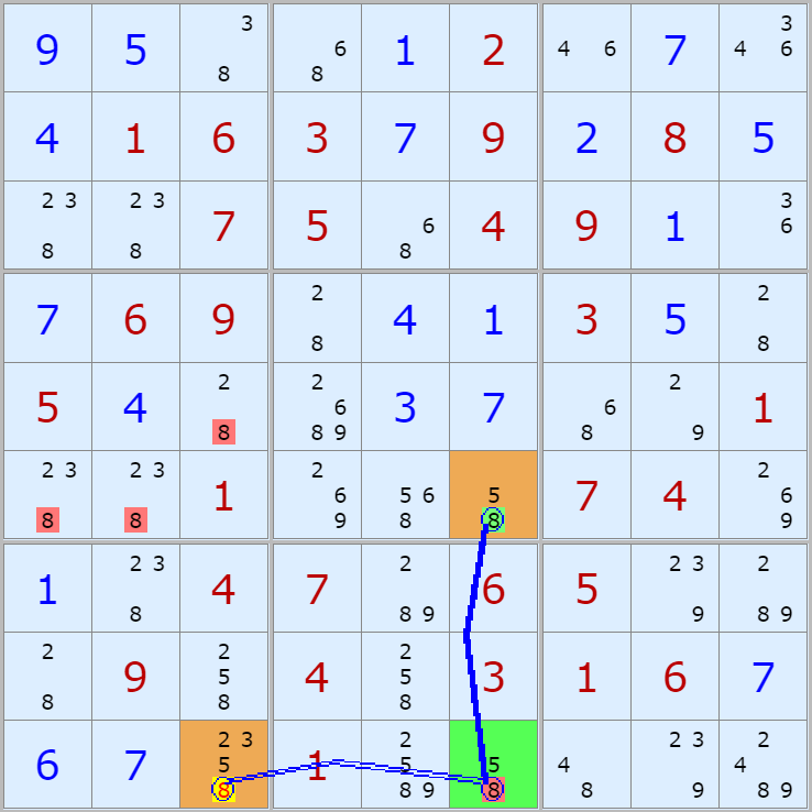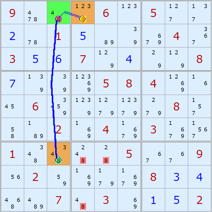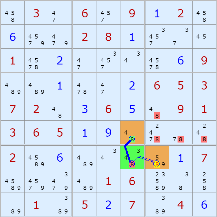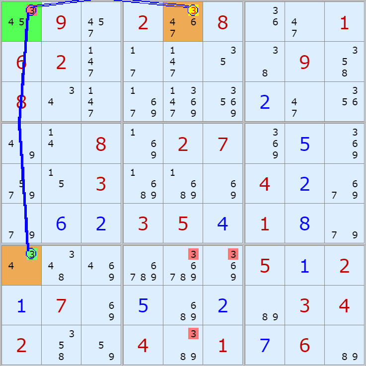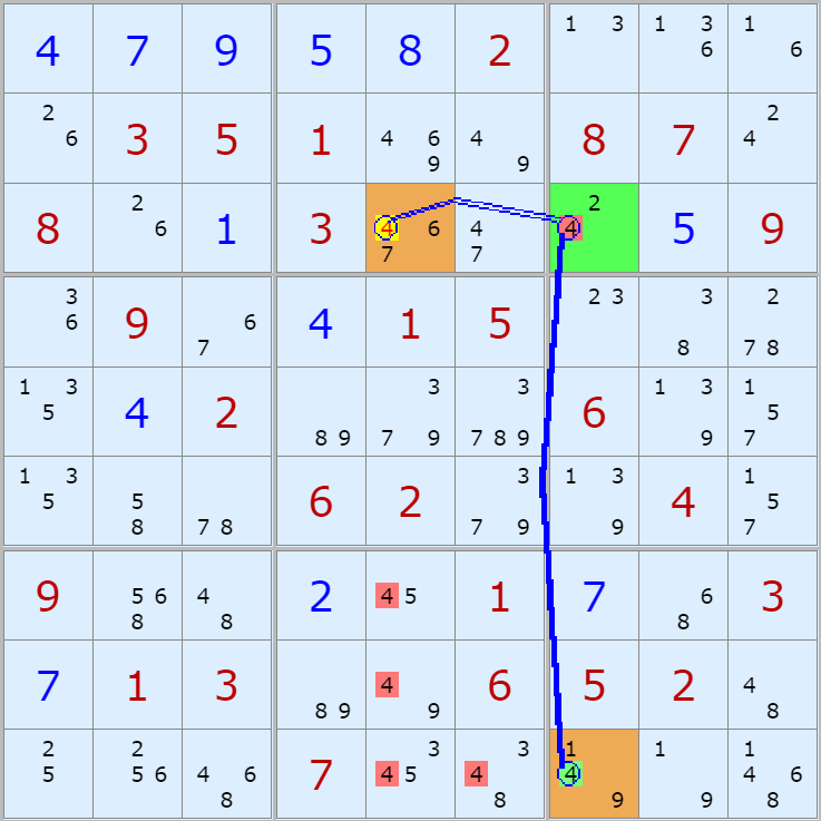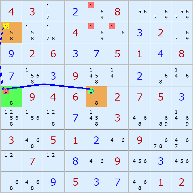 일단 형태는 우리가 잘 알고 있는 Y윙의 형태를 닮았다. 그런데 한 가지 다른 점은 시작점과 끝점이 마주 보는 (1,6)의 후보수9가 아닌 체인의 끝점(1,2)의 후보수 9가 지워진다는 것이다.