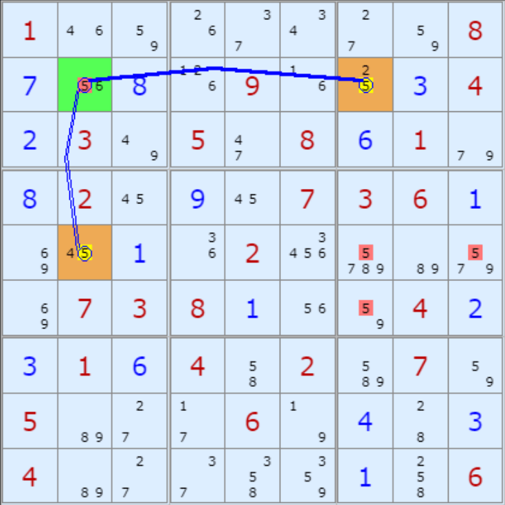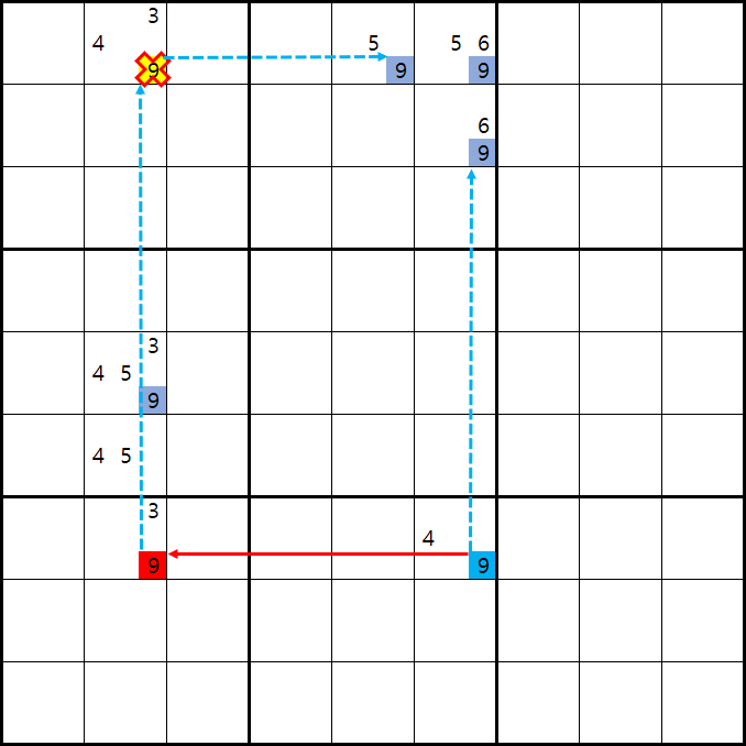 시작점 (7,6)의 후보숫자 9가 확정숫자가 된다면 (1,5)의 후보숫자 9 또한 무조건 확정숫자가 되야 한다.