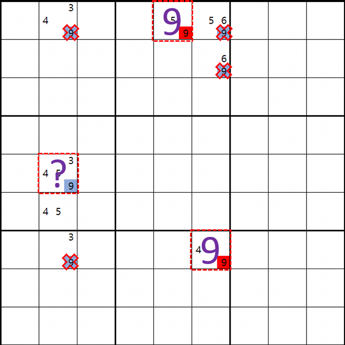 (7,2)칸의 후보숫자 9가 확정 숫자가 되고 (셀2의 후보숫자 '?' 표시된 3개의 칸 중에 하나는 반드시 9가 되어야 한다.)
