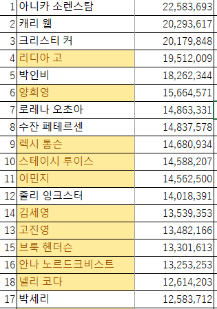 박인비 [21], 하타오카 나사 [6], 전인지 [4], 애슐리 부하이 [2], 그레이스 김 [1] |