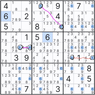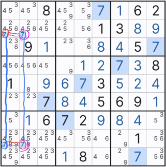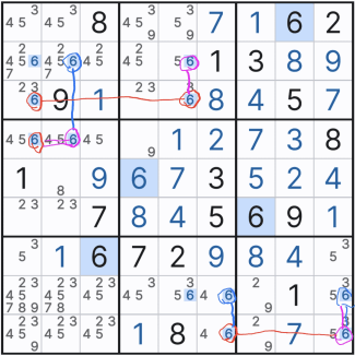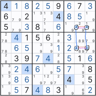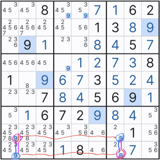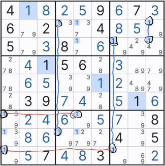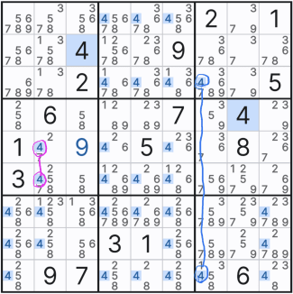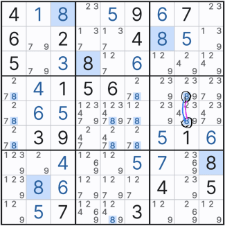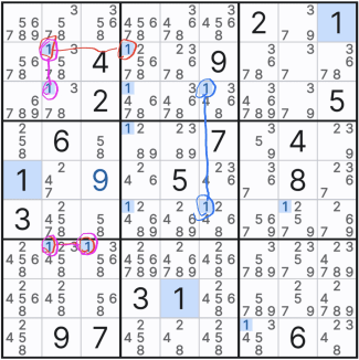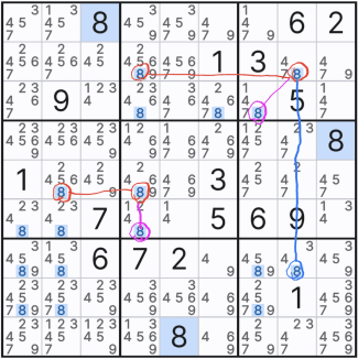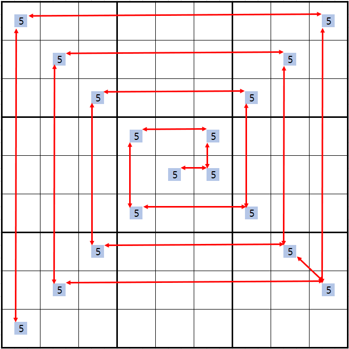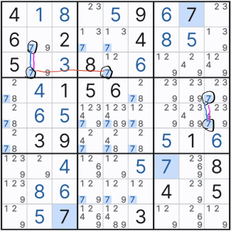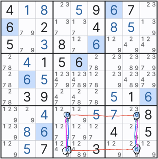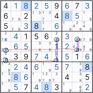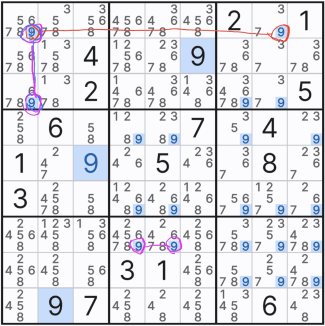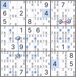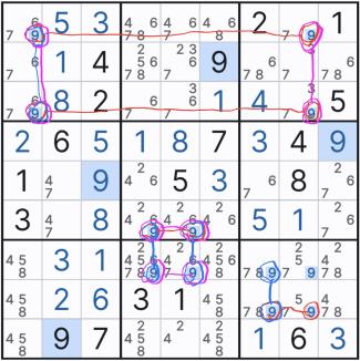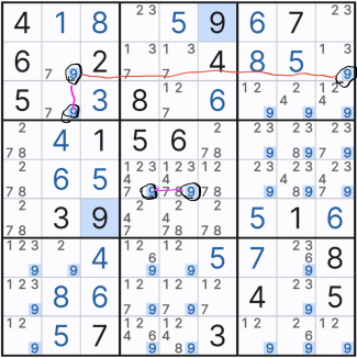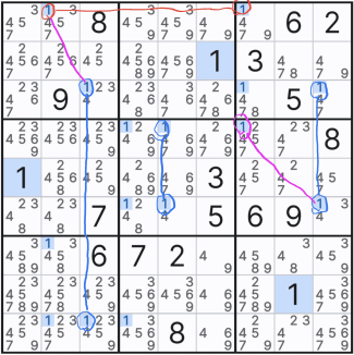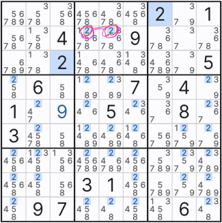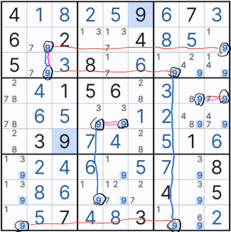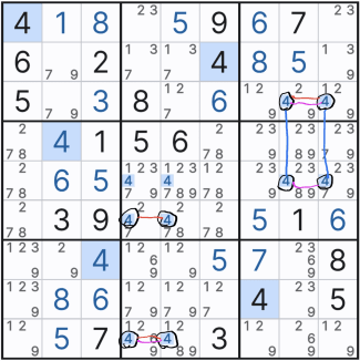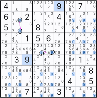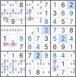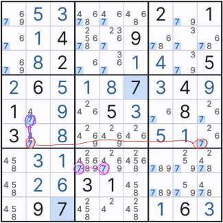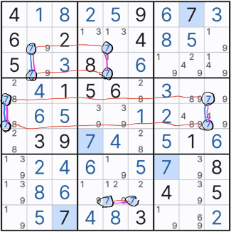 위의 움짤만 보면 스트롱링크 찾는 것은 일도 아니다. 그저 행,열 또는 박스 안에 후보숫타 x가 2칸에만 존재하는 것을 찾으면 되기 때문이다. 단, 실전에서는 위크링크와 혼재되어 있다. 또한 위의 기본 형태 말고 변형된 형태가 되면 아래와 같아진다. 확정숫자를 찾을 때마다... 스트롱 링크가 위크링크가 되기도 하고 위크 링크가 스트롱 링크가 되는 경우가 반복될 수도 있다.