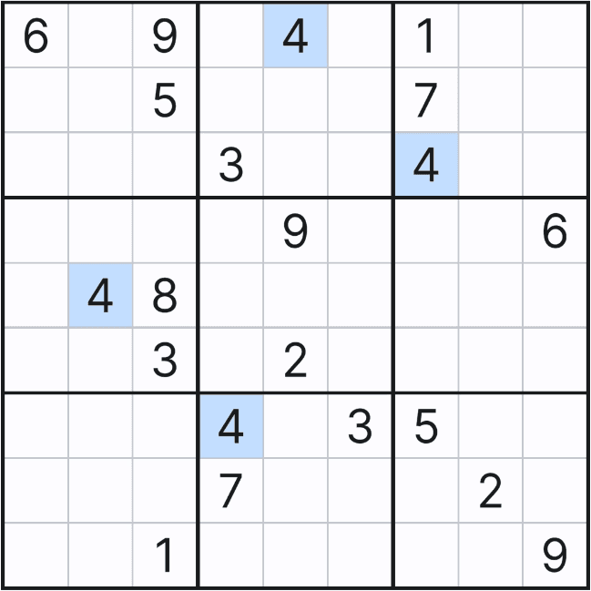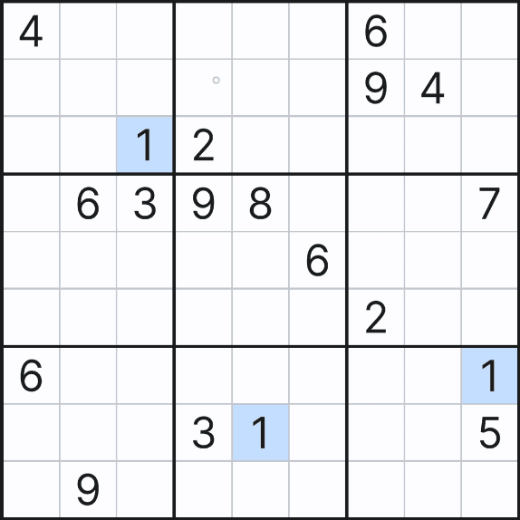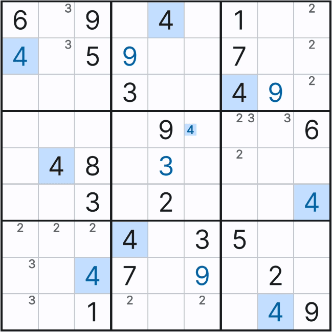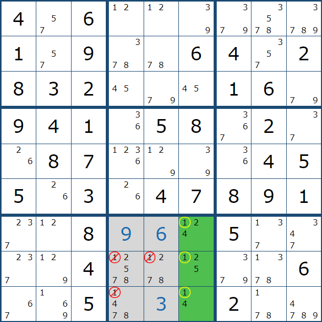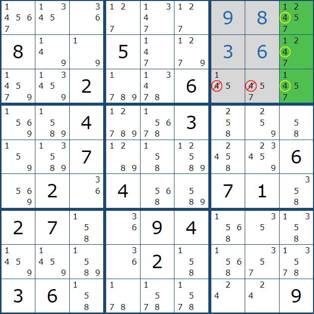 자세히 보면 박스 5에서 (4,6)칸에만 후보숫자 4가 있음을 알 수 있다.