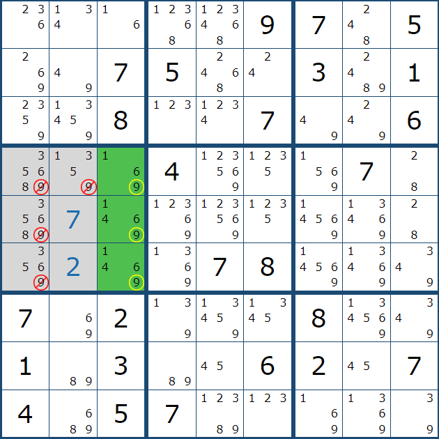 이렇듯, 스트롱 링크는 명칭대로 강한 힘을 쓰는데 셀 안에 잠긴 숫자는 특히 강력하다. 이렇게 그룹 링크는 연속된 2개의 링크가 될 수도 있고, 아래와 3개의 연속된 위크링크 후보숫자도 박스에 잠기면 스트롱 링크와 같은 그룹 링크가 되어 힘을 발휘 하는 경우가 있다.