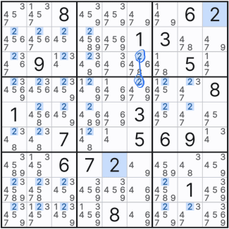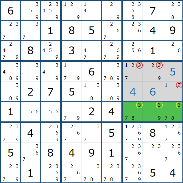 (1,2) 또는 (2,2) 2칸 중에 하나에만 후보숫자 3이 확정숫자가 될 수 있다는 의미로,