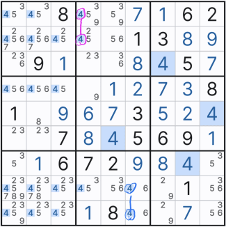 1. 스트롱 링크와의 만남.. 아래와 같이 주어진 확정숫자 갯수가 4개나 있는 4에 대한 풀하우스 찾기를 하다가, 다음 숫자 3에서 처음으로 박스1에 첫 후보숫자 3 두개를 채웠다.