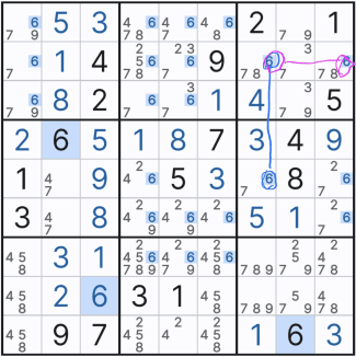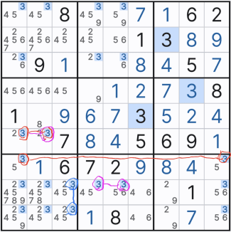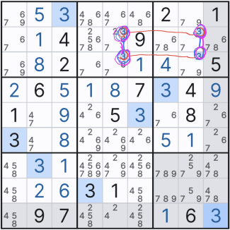 그래서 잠긴 후보숫자 3이 그룹링크가 되어 준 확정숫자 3의 역할을 담당하게 되는 것이다.
