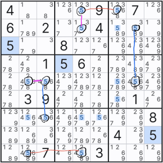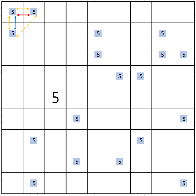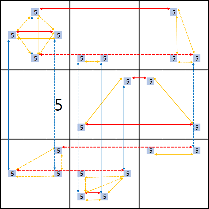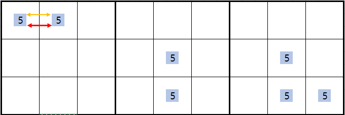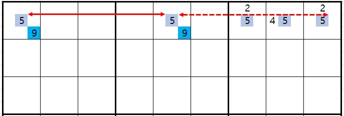 보통 위의 움짤에서 박스 1에 후보숫자 5 두 개를 연결하면 스트롱 링크고, 박스2에 후보숫자 5가 더 있다면 위크 링크로만 보게 되는데 이 것은 반만 맞다. 왜냐하면 아래와 같이