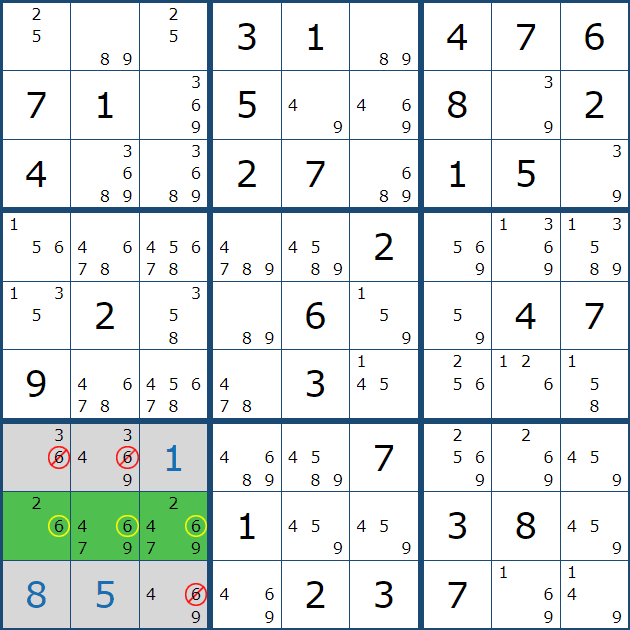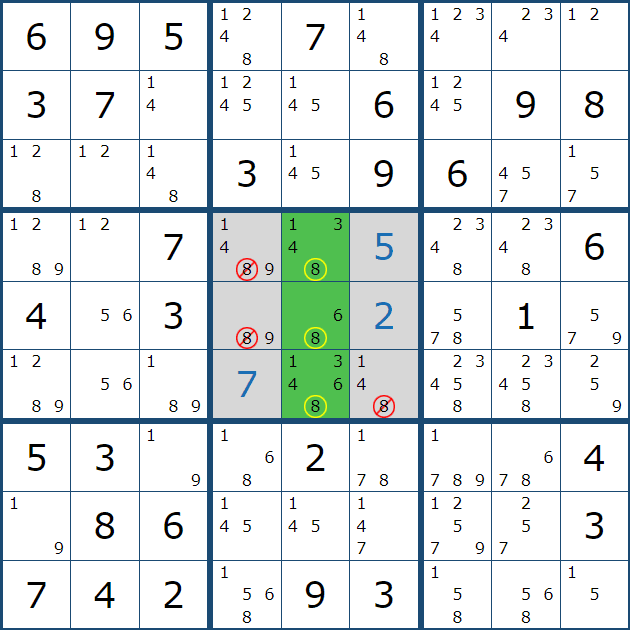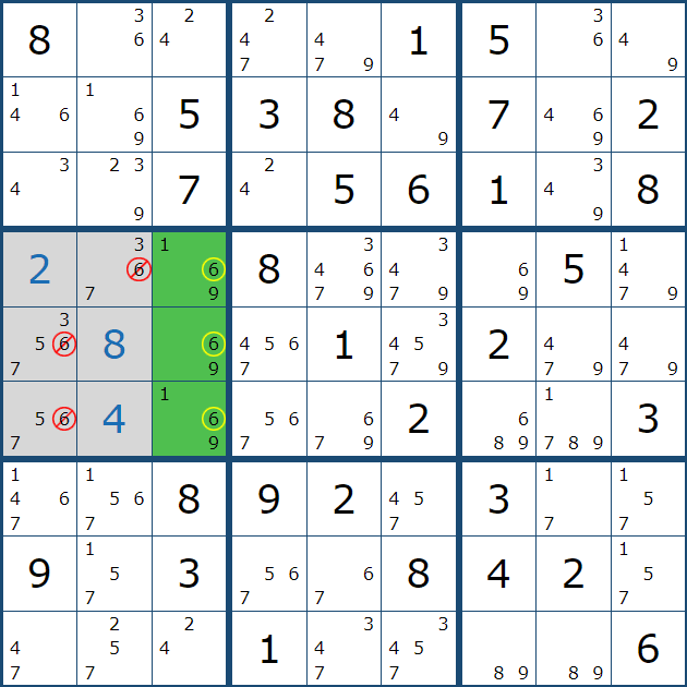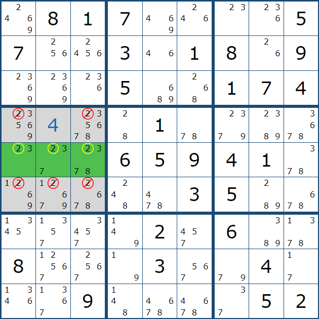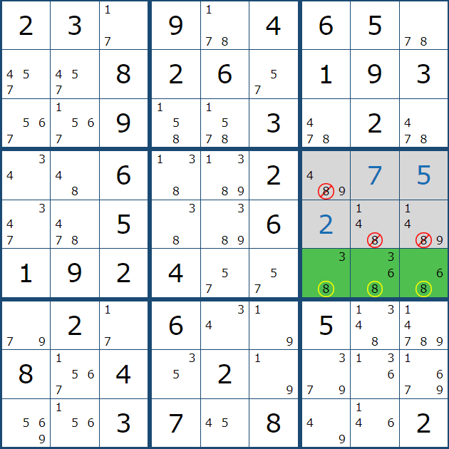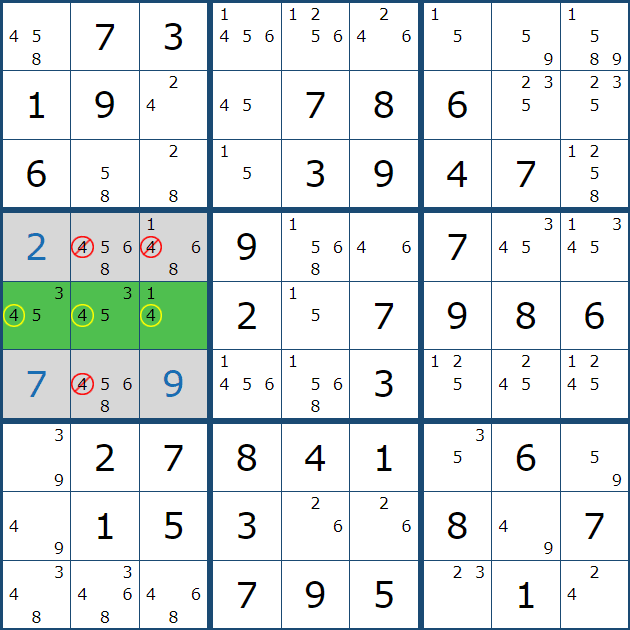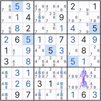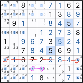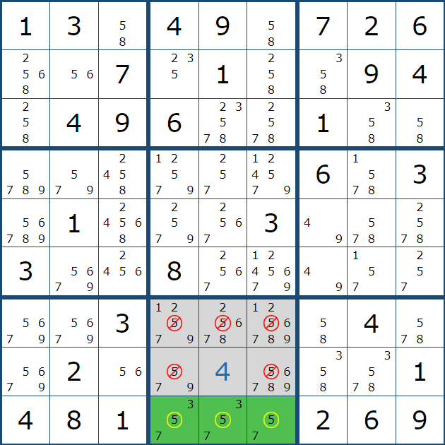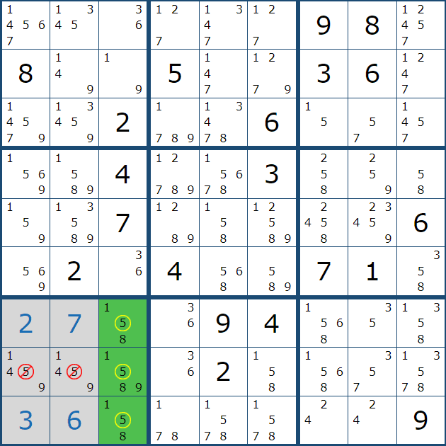 위와 같은 상황을 박스 5에 후보숫자 전체를 채웠을 때 상황과 비교해 보겠다.
