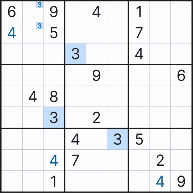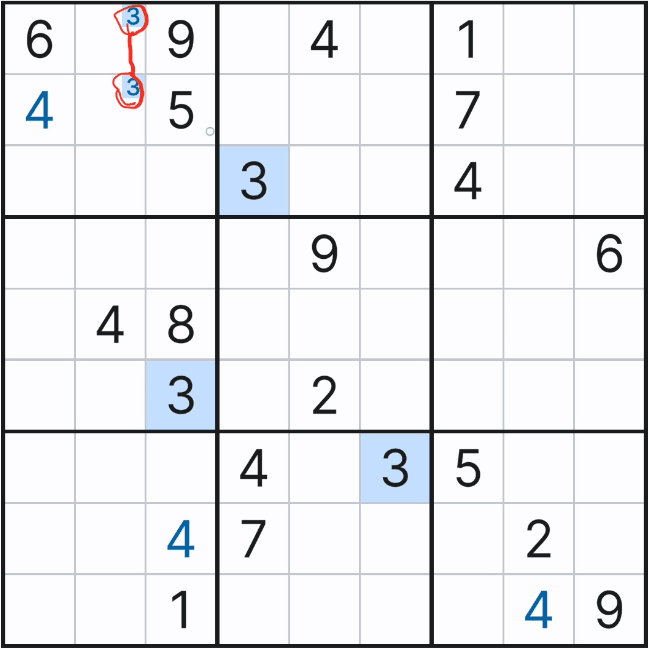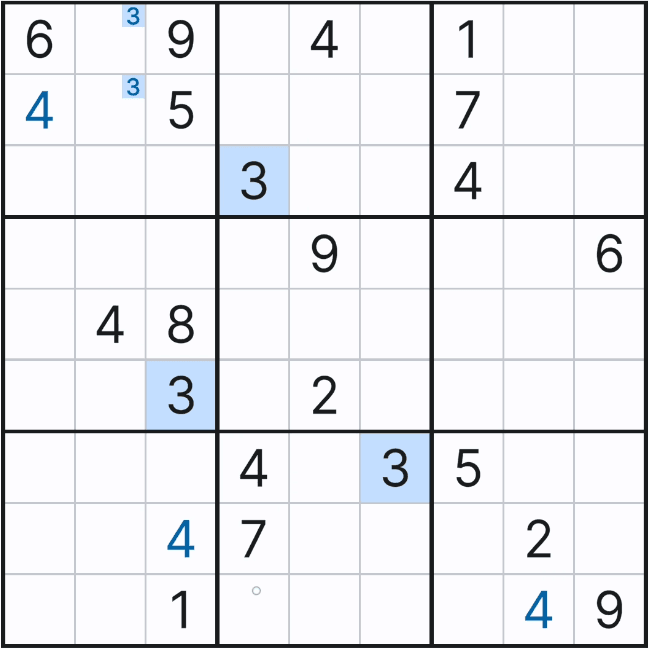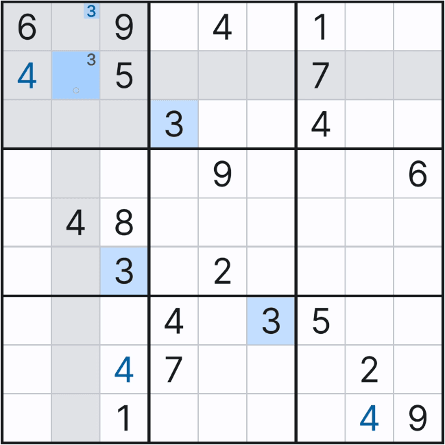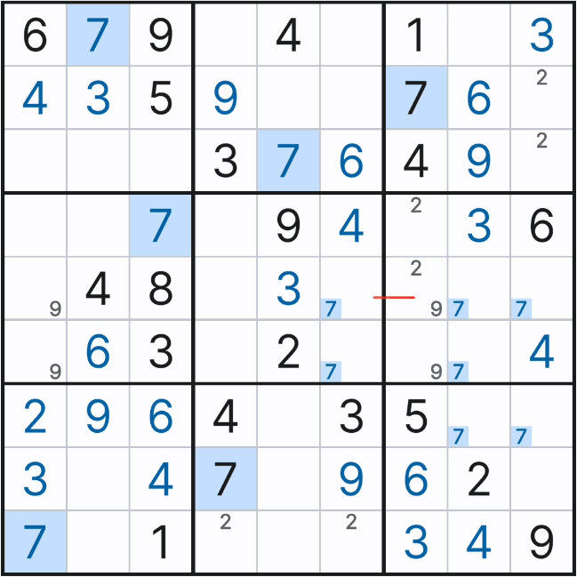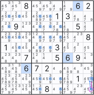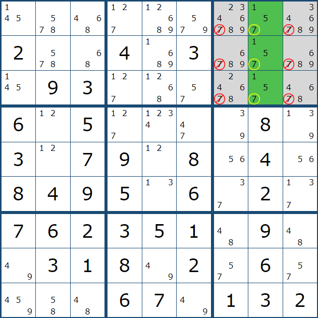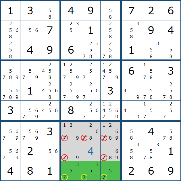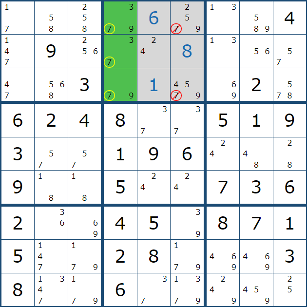 그래서 아래와 같이 셀 7에서 (7,1), (8,1), (9,1) 칸에만 후보숫자 3을 노트할 수 있었다.