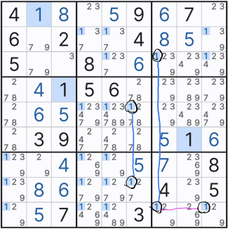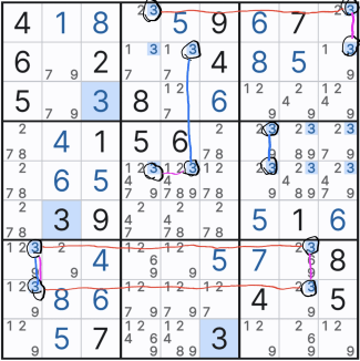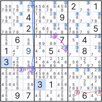 이렇게 기입한 이유는 박스1의 후보숫자 3의 '스트롱 링크'에 의한 것인데 움짤로 보자..