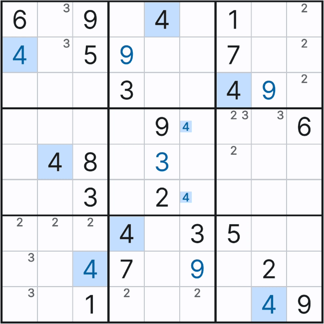 여러분이 들어 봤을 만한 X윙, Y윙, 소드피쉬, 젤리 피쉬, 숨겨진 트리플 등 많은 전략들은 이 링크들의 관계가 특정화된 공식이라고 보면 되겠다. (A^2+B^2=C^2 이라는 피타고라스의 정리 처럼 말이다.) 그럼 이 2개 이상의 숫자가 링크되는 형태는 어떤지, 서로 연결되면 무슨 일이 생기는지는 실제 스도쿠를 푸는 움짤을 보며 설명해 나가도록 하겠다.