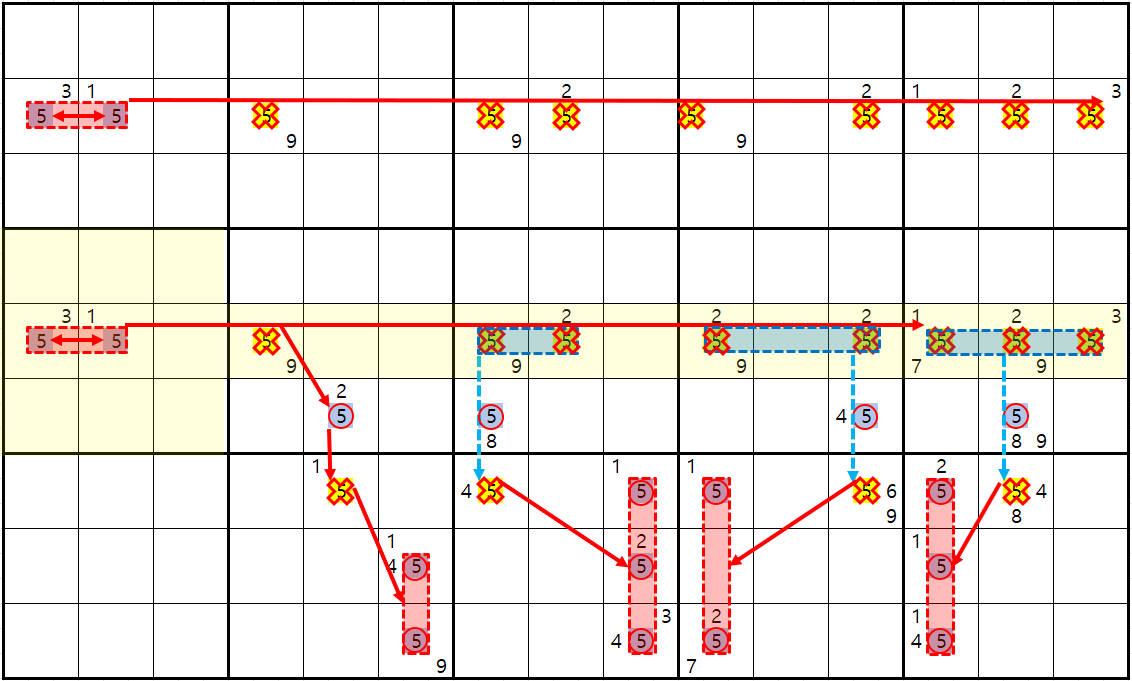다시 설명하겠다. 박스안에 후보숫자 X 가 연속된 행 열에 2개만 존재 할 때는 셀에서 잠긴 후보숫자로 박스내에서는 무조건 스트롱 링크로 연결이 된다.