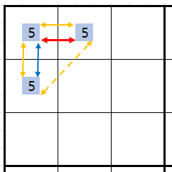 마지막으로 언제나 강력한 링크가 되는 경우가 또 하나가 있다. 위의 그림에서는 숫자 5에 대해서만 썼는데 아래와 같이 다른 숫자와 연결될 때, '이중 위치'링크 XY- XY끼리의 링크는 같은 하우스에 3개 이상의 숫자가 있어도 아래 그림과 같이 언제나 스트롱 링크가 된다.