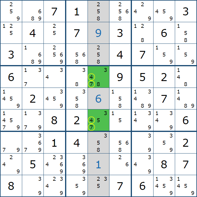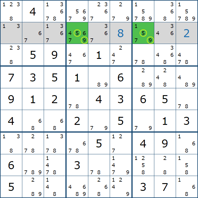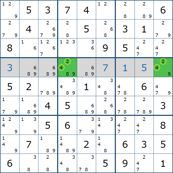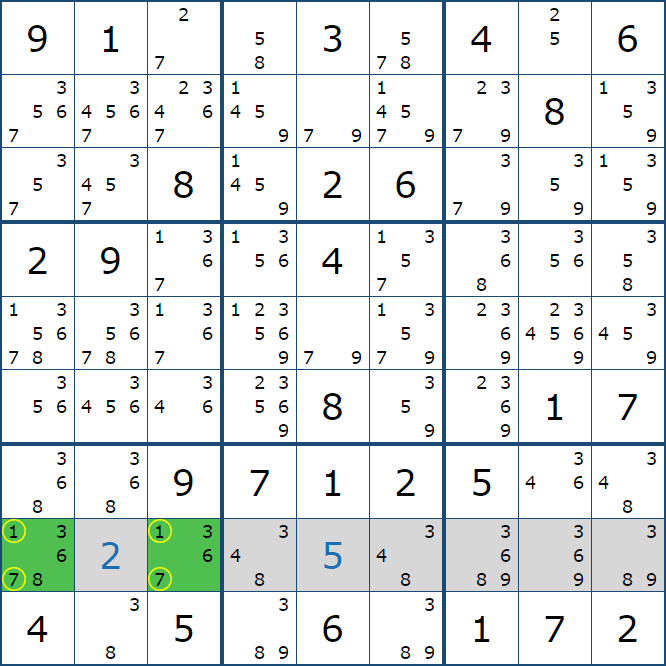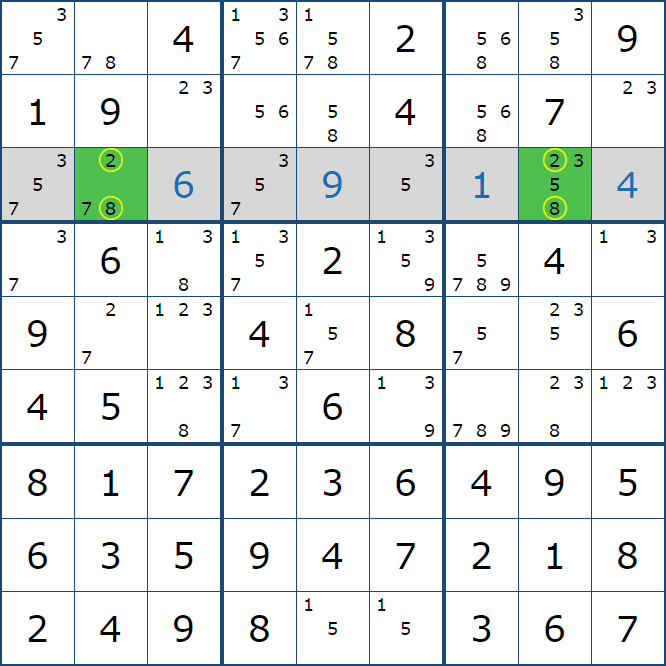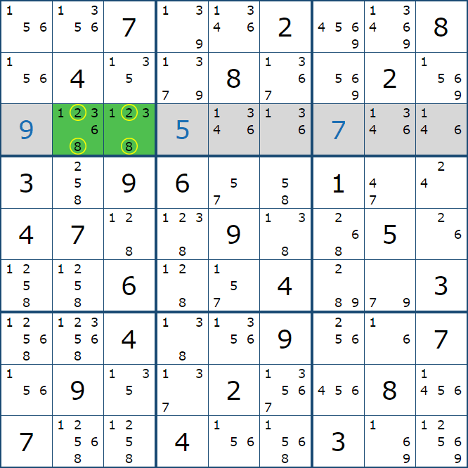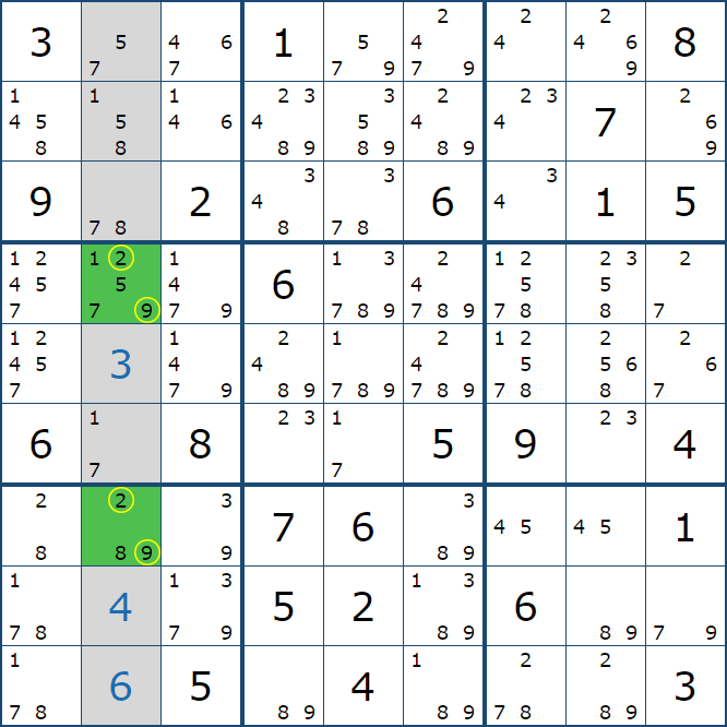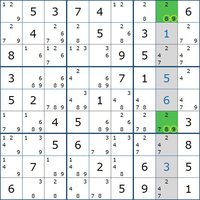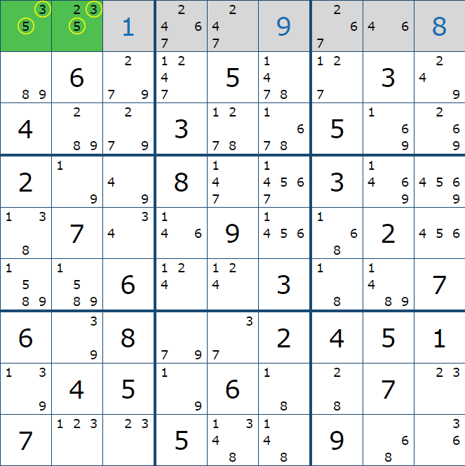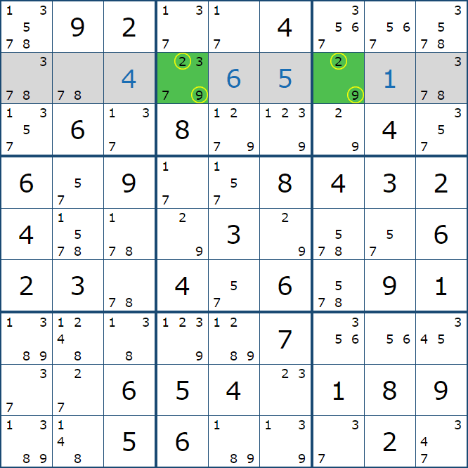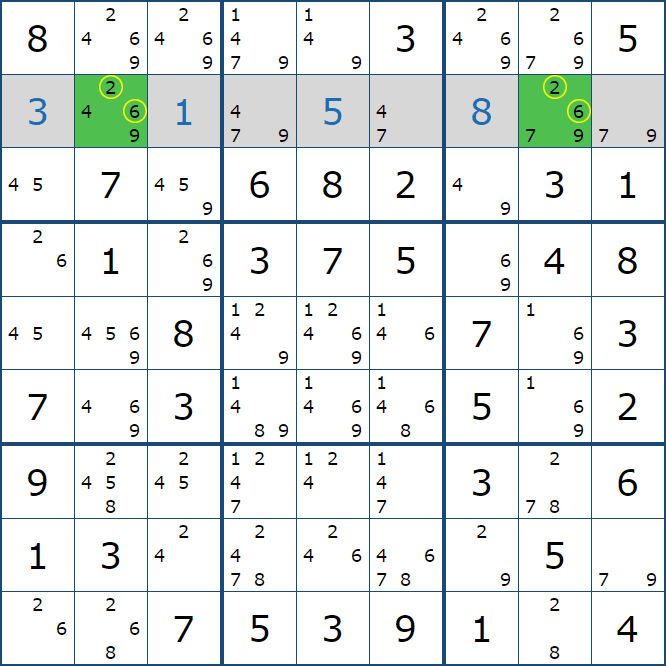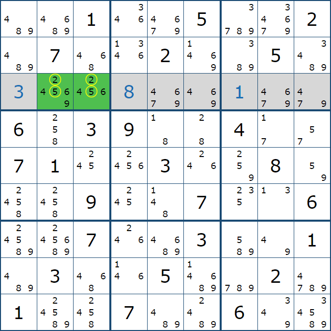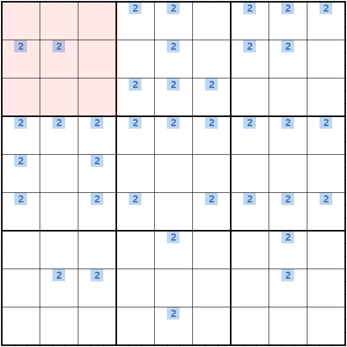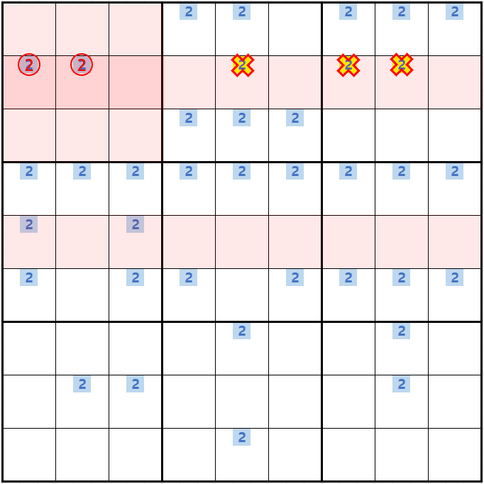 위와 같이 한셀에 후보숫자 2가 연속된 행 또는 열에 존재하는 경우 아래와 같이 두 개의 칸에 무조건 후보숫자2가 확정이 된다.