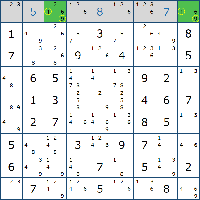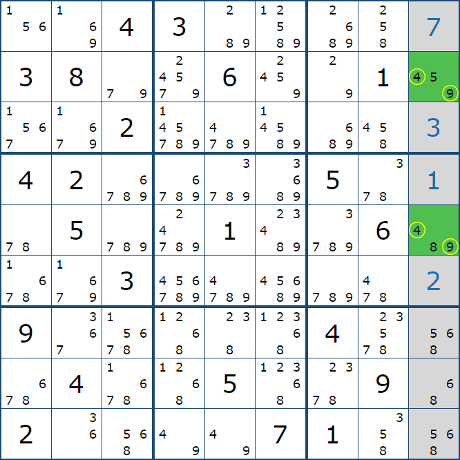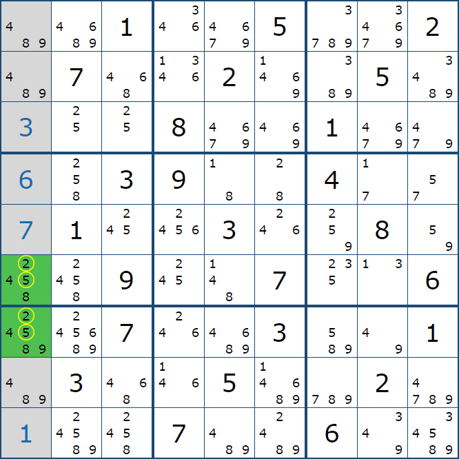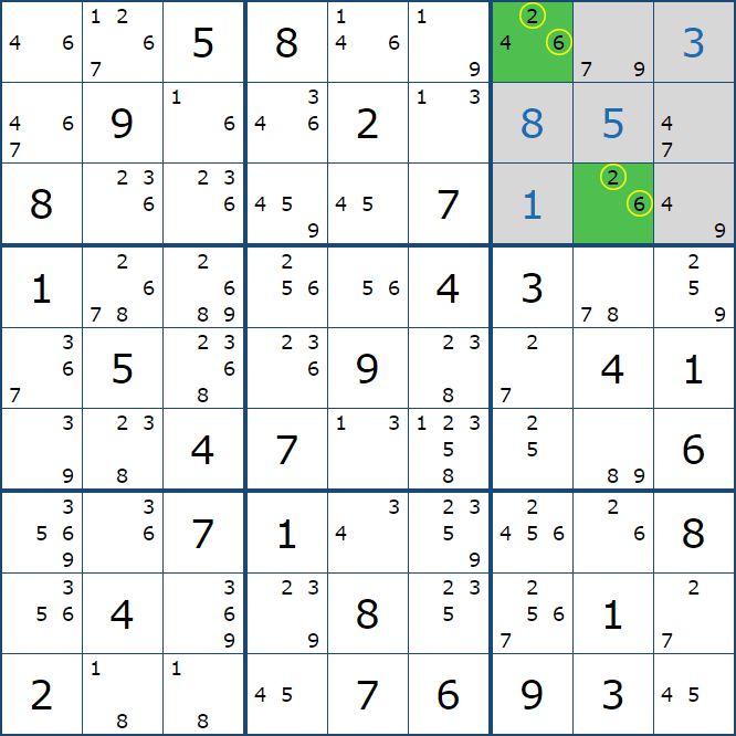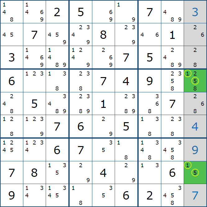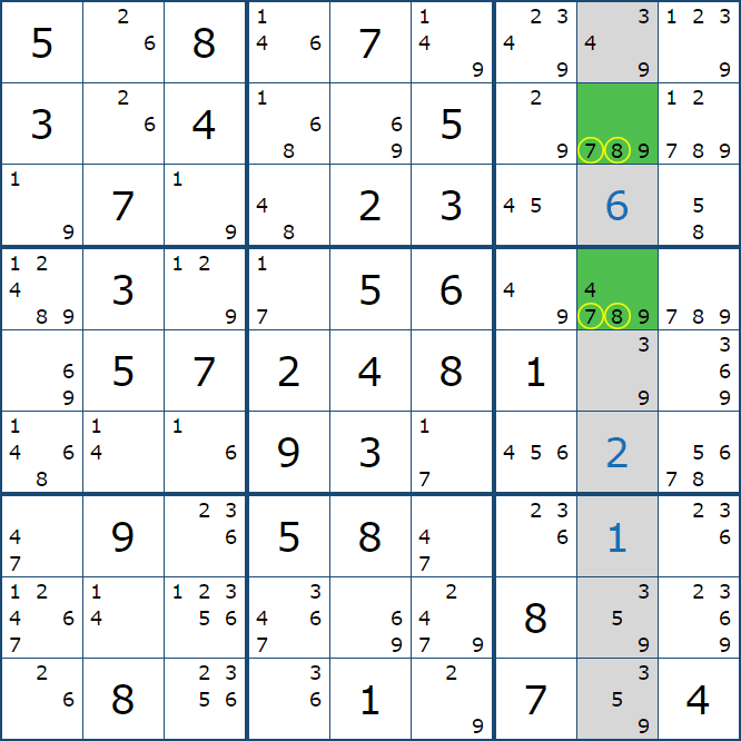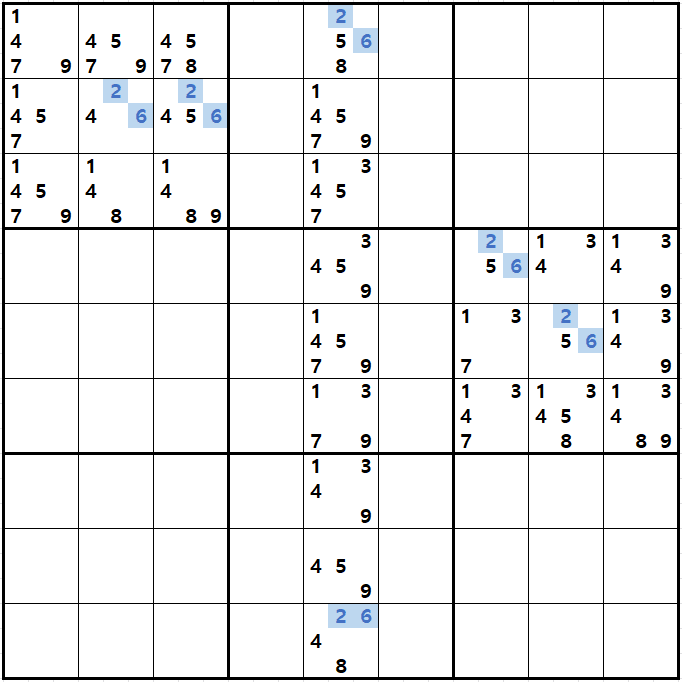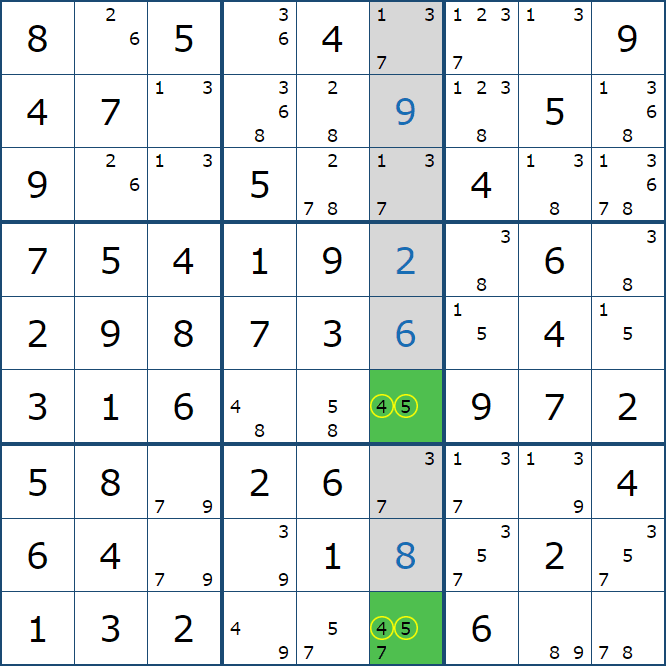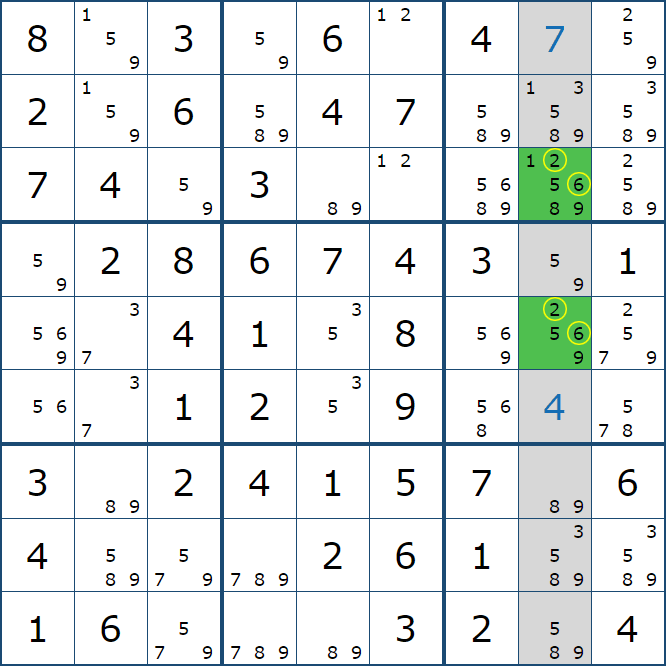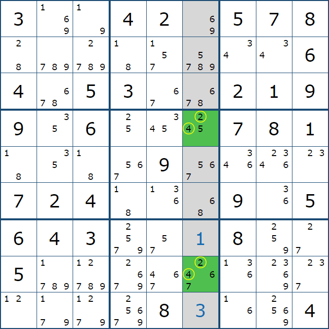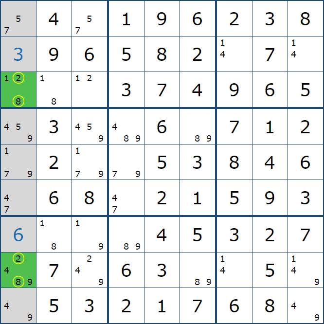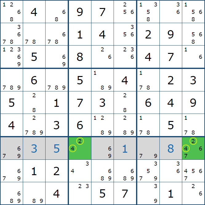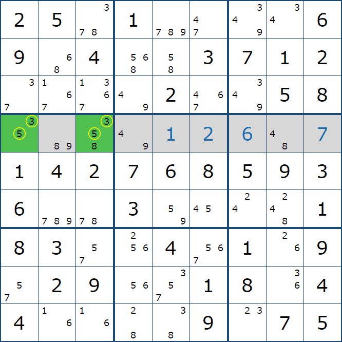 위와 같이 한셀에 후보숫자 2가 연속된 행 또는 열에 존재하는 경우 아래와 같이 두 개의 칸에 무조건 후보숫자2가 확정이 된다.