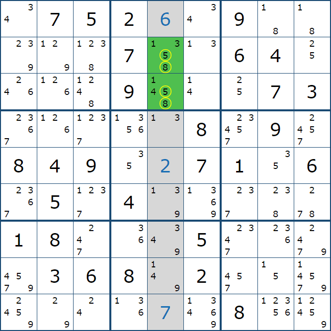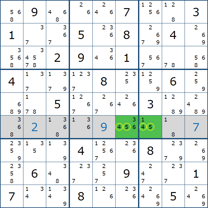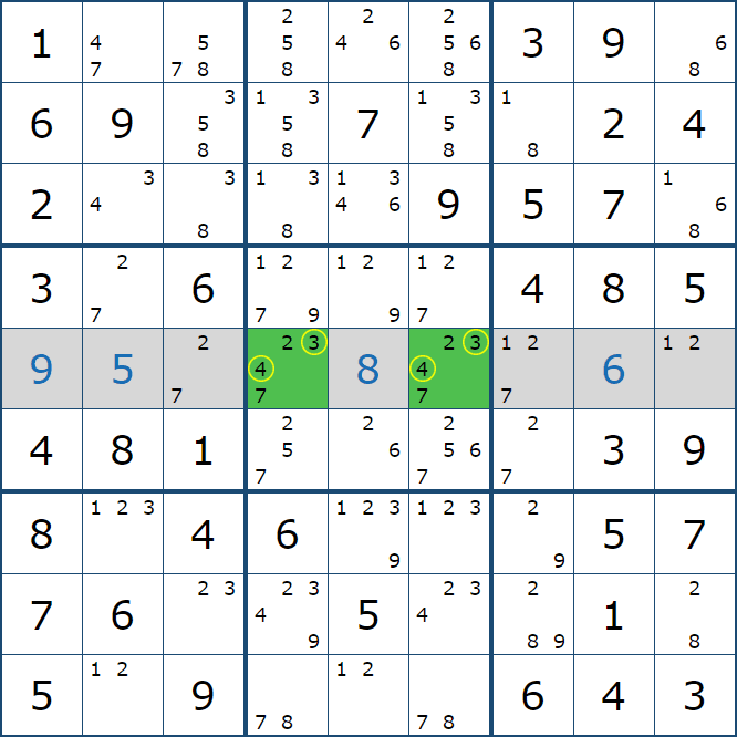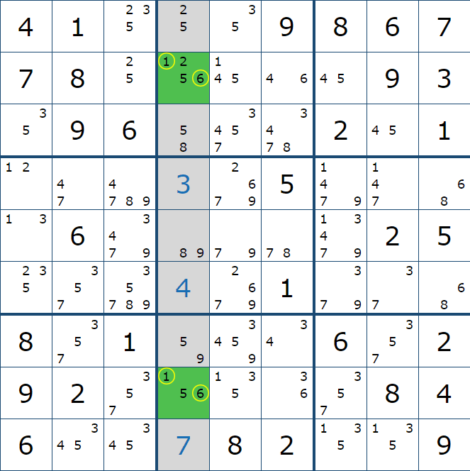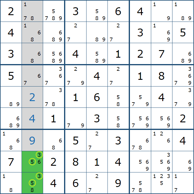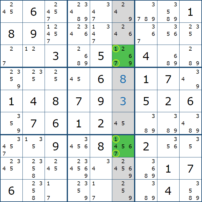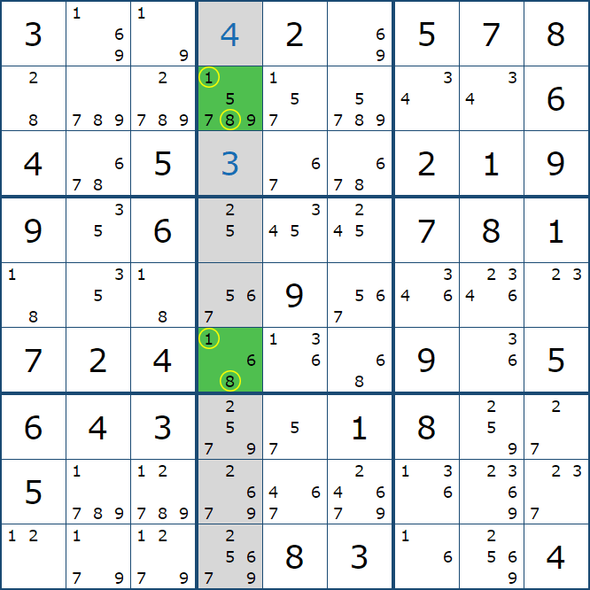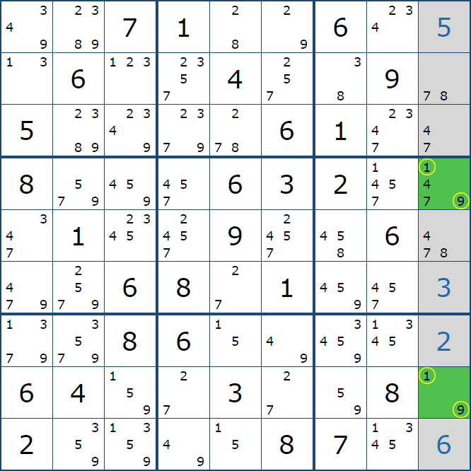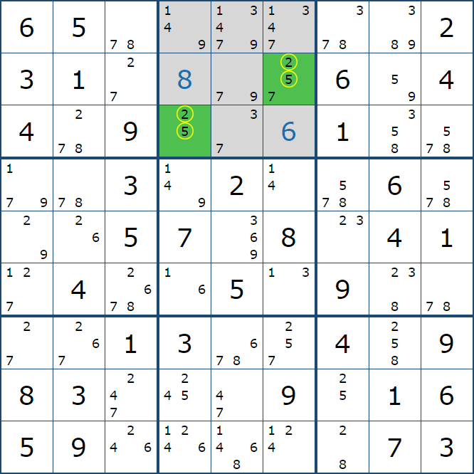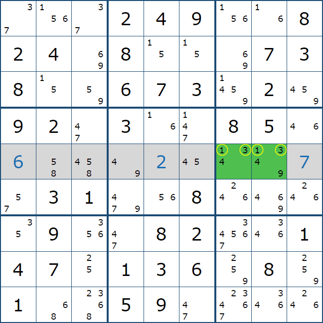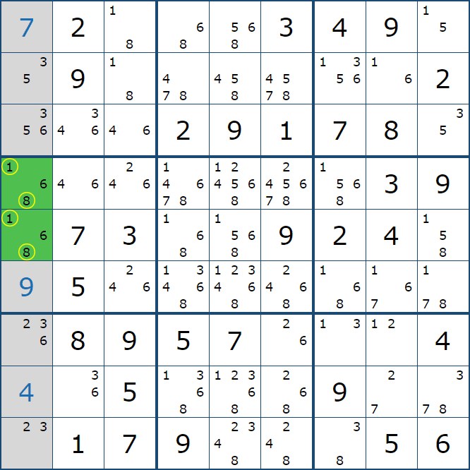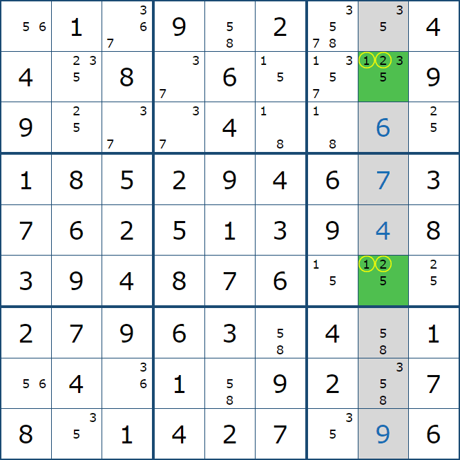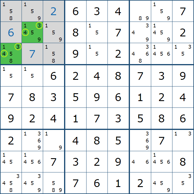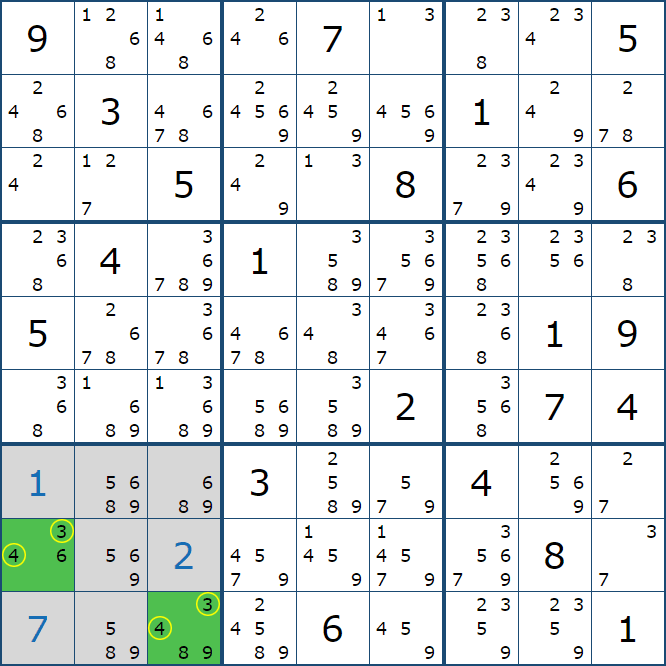위와 같이 한셀에 후보숫자 2가 연속된 행 또는 열에 존재하는 경우 아래와 같이 두 개의 칸에 무조건 후보숫자2가 확정이 된다.