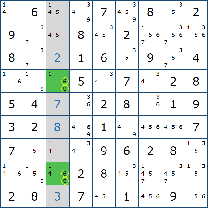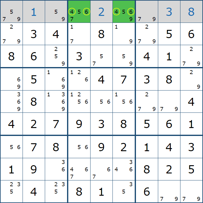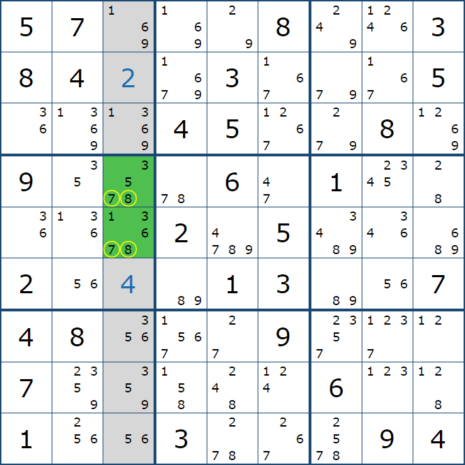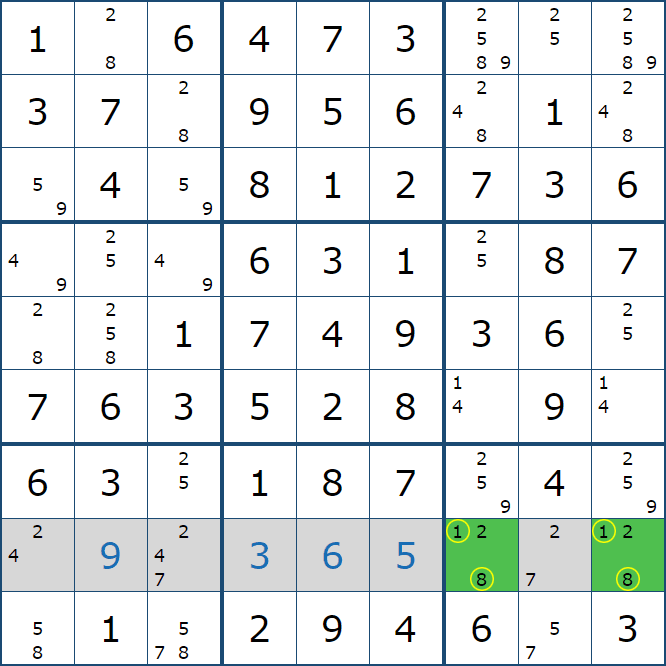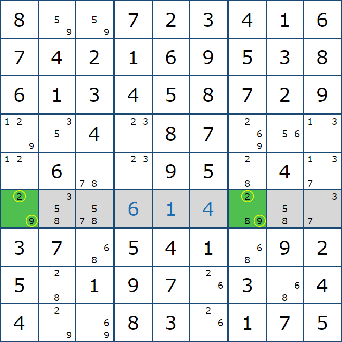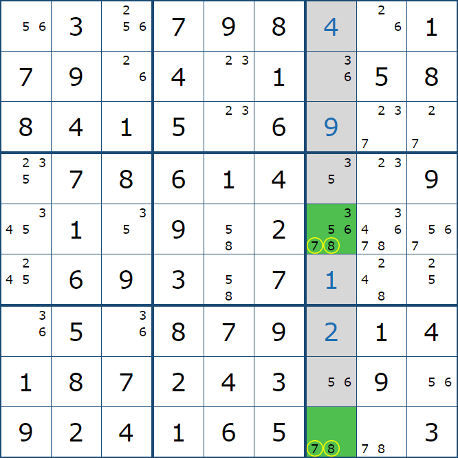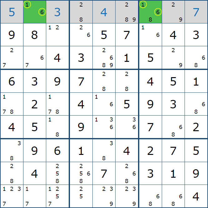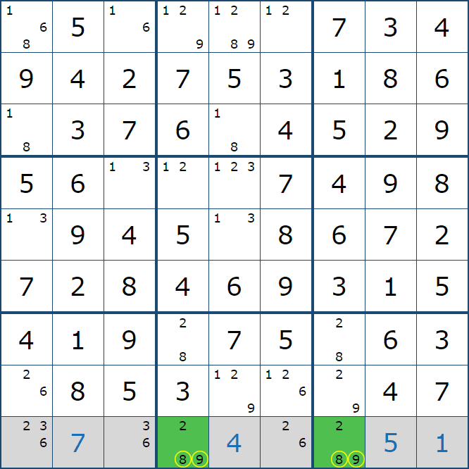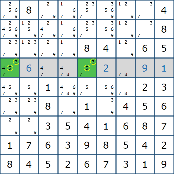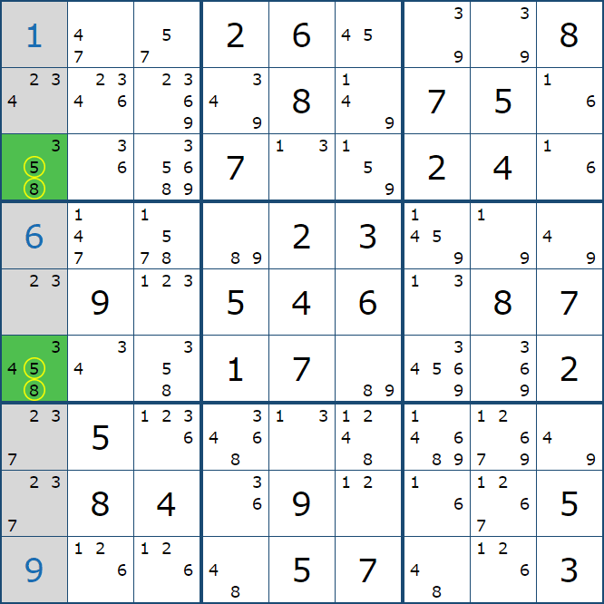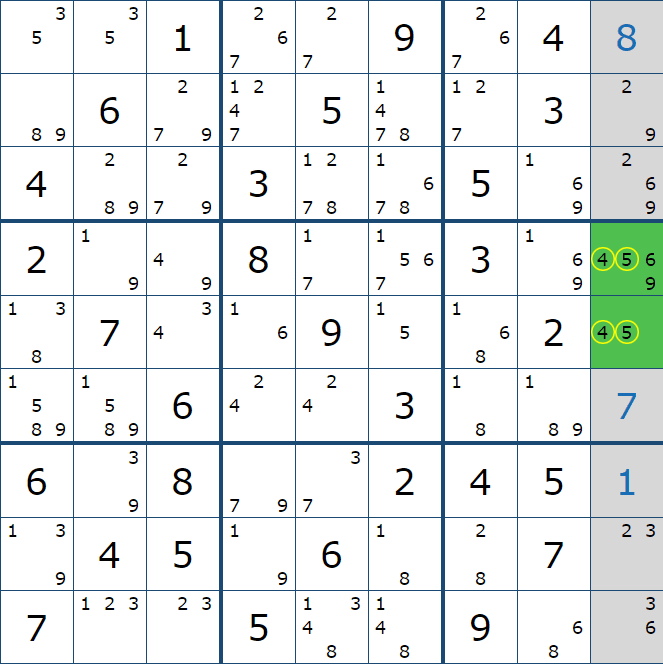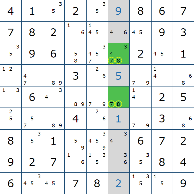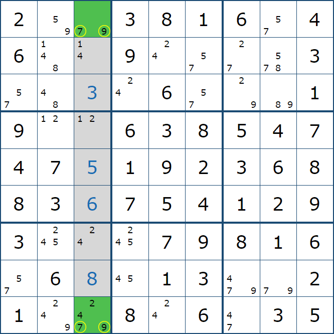 위와 같이 한셀에 후보숫자 2가 연속된 행 또는 열에 존재하는 경우 아래와 같이 두 개의 칸에 무조건 후보숫자2가 확정이 된다.