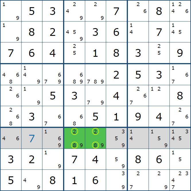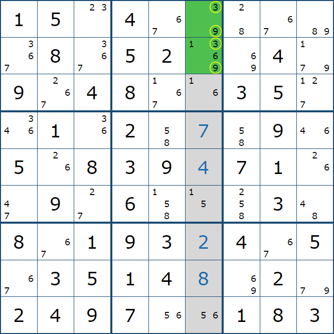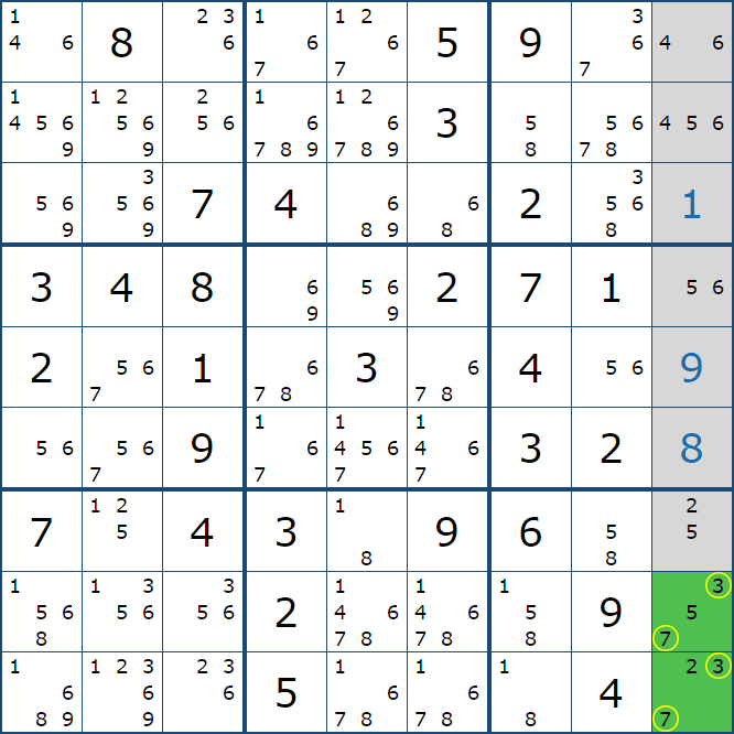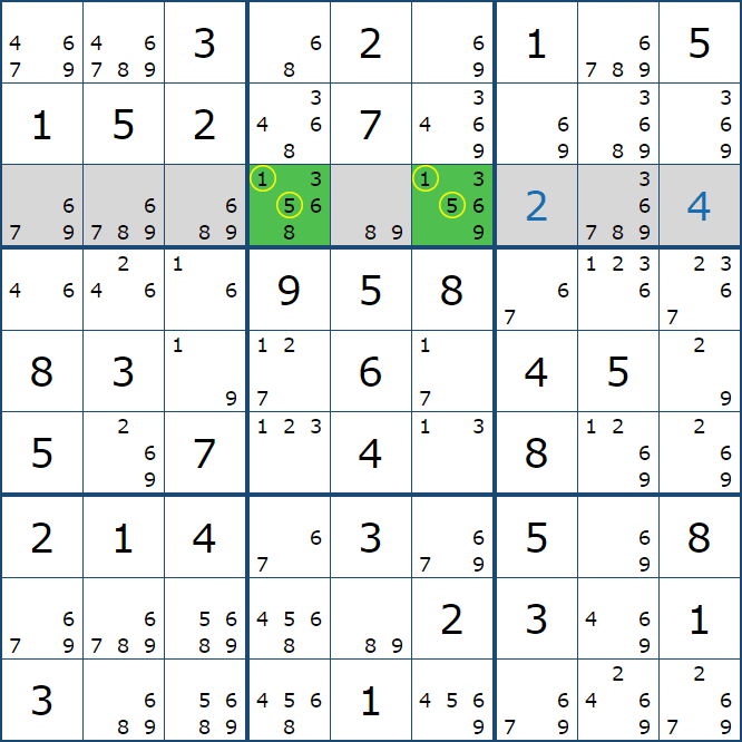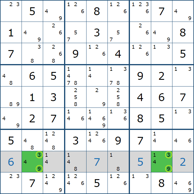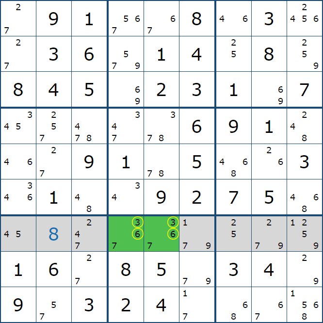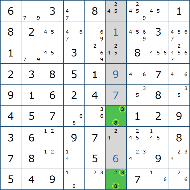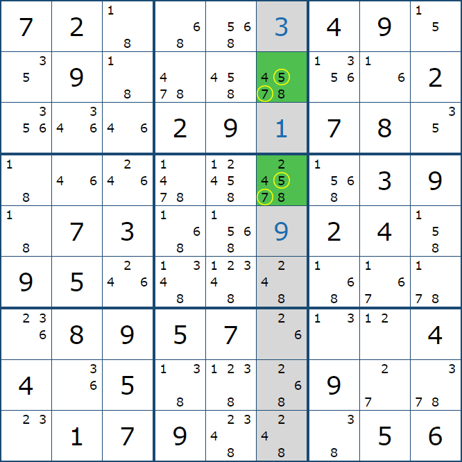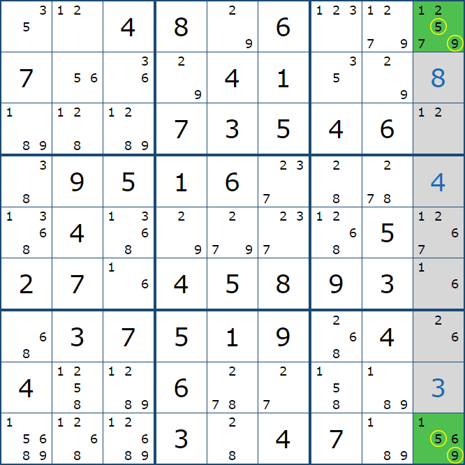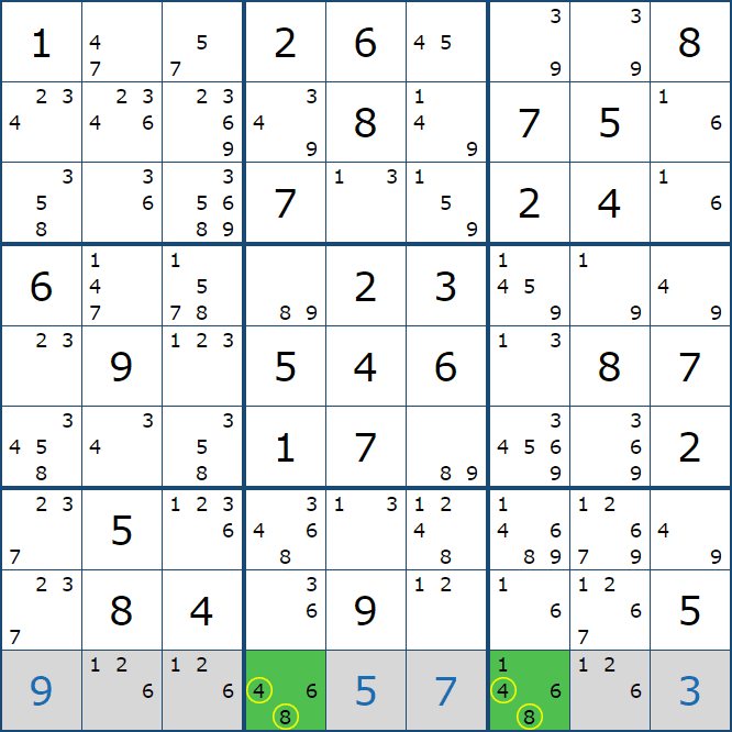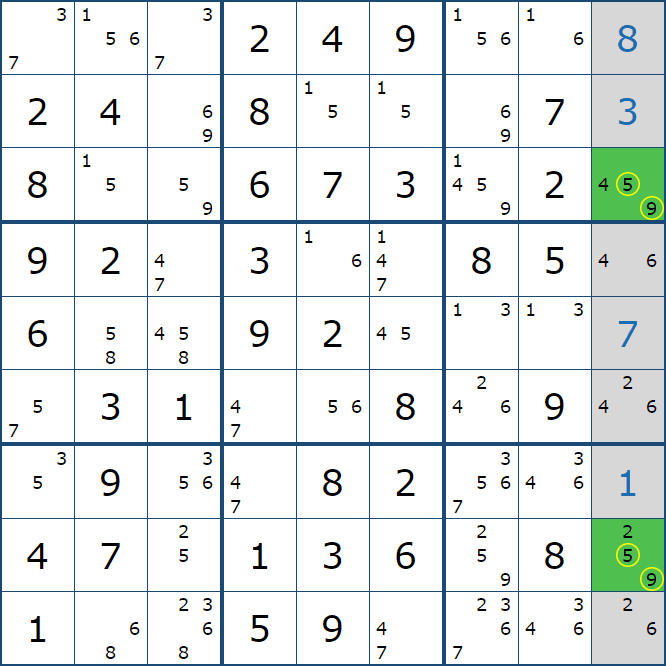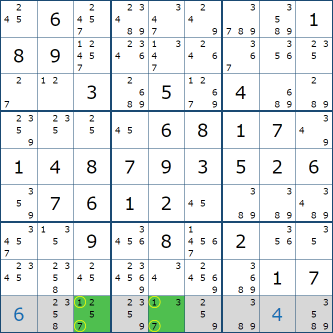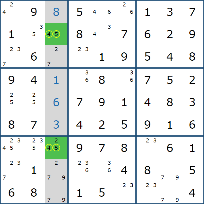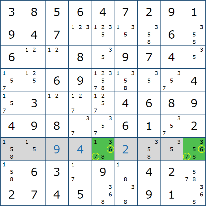 위와 같이 한셀에 후보숫자 2가 연속된 행 또는 열에 존재하는 경우 아래와 같이 두 개의 칸에 무조건 후보숫자2가 확정이 된다.