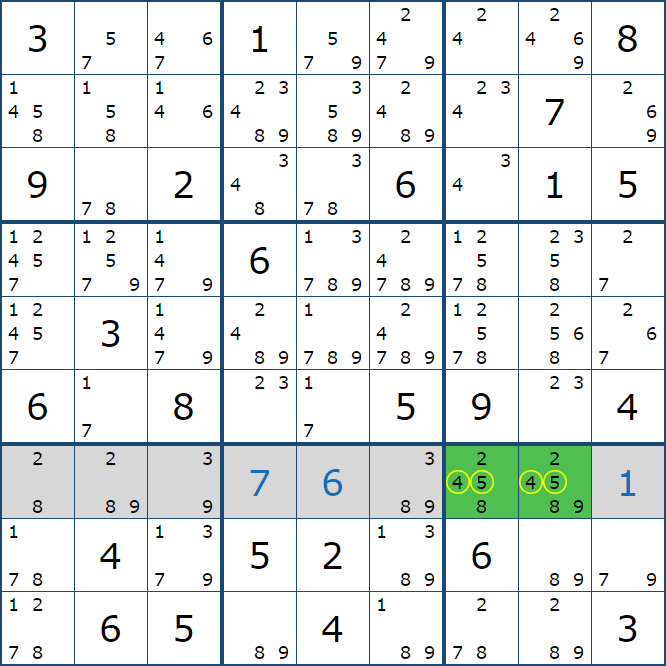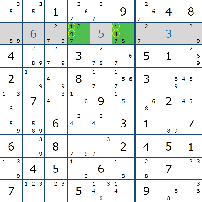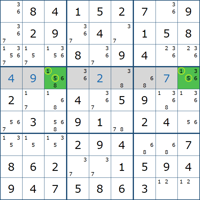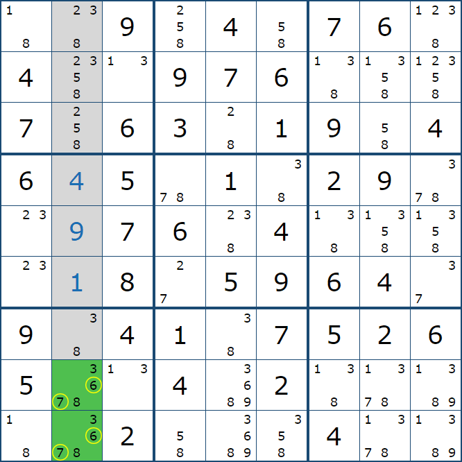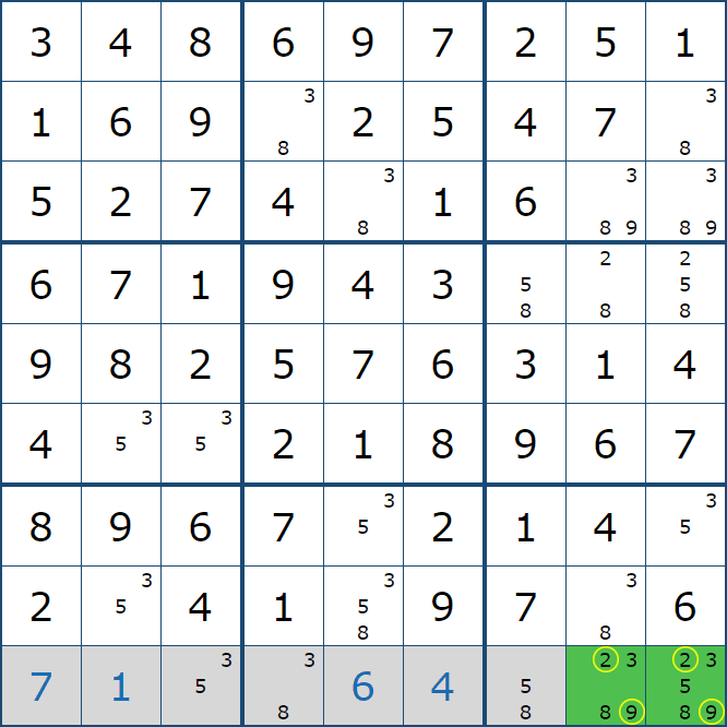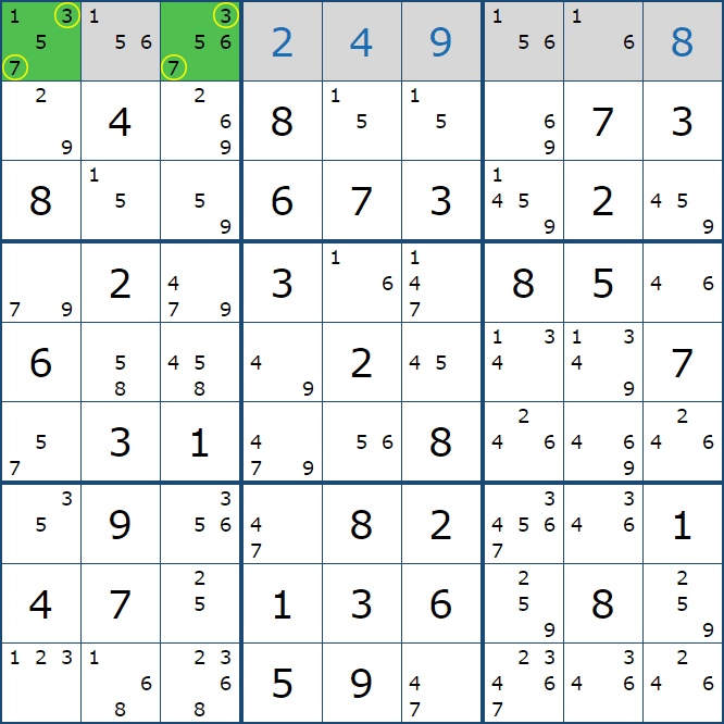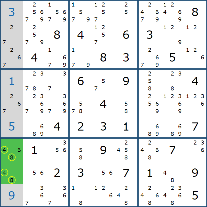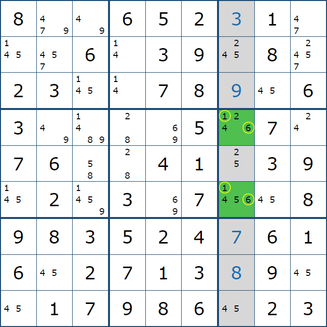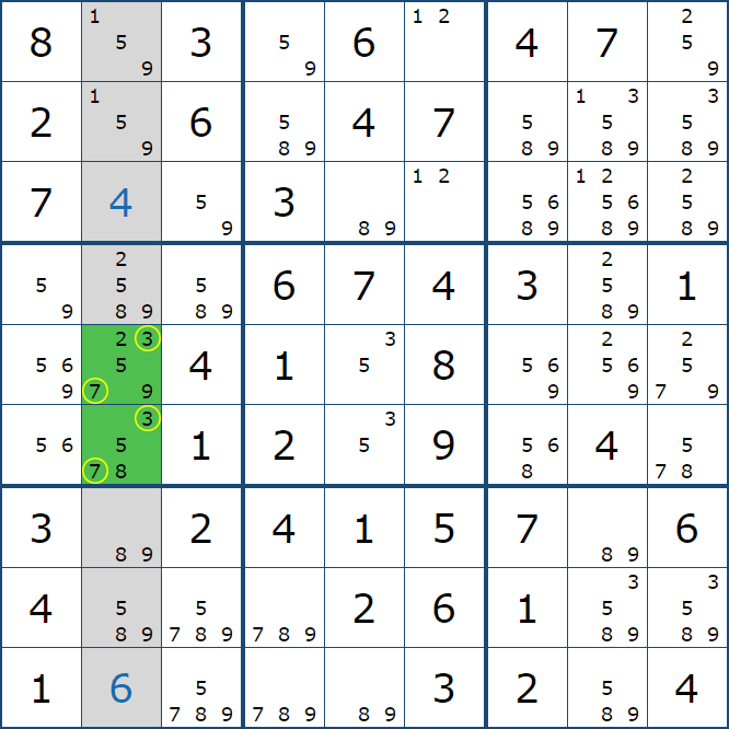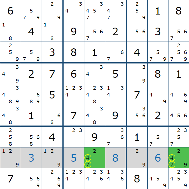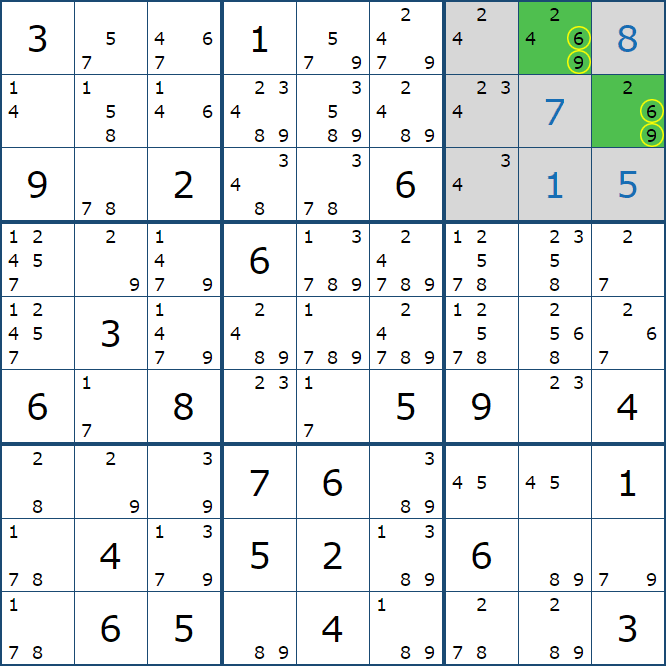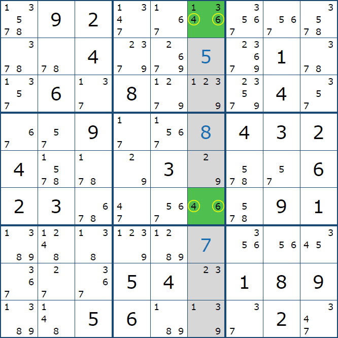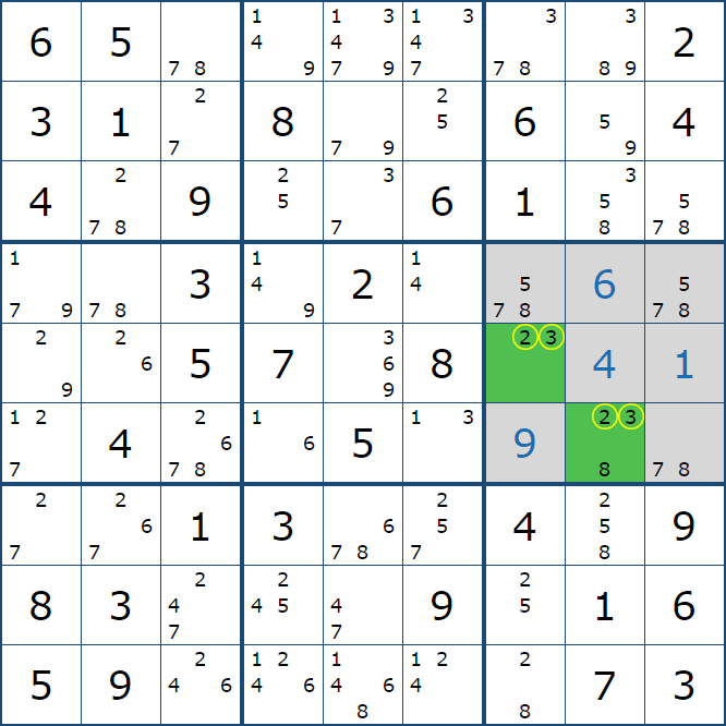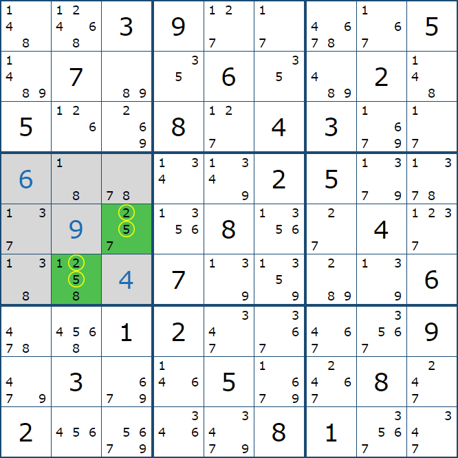 위와 같이 한셀에 후보숫자 2가 연속된 행 또는 열에 존재하는 경우 아래와 같이 두 개의 칸에 무조건 후보숫자2가 확정이 된다.