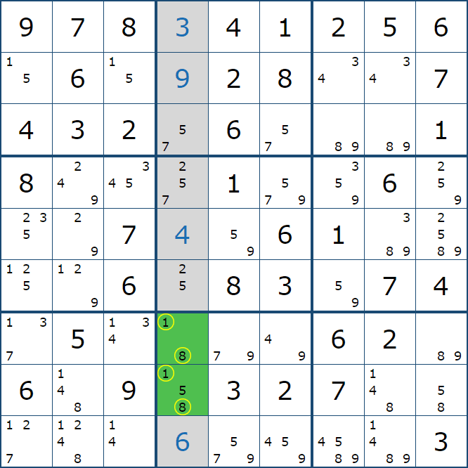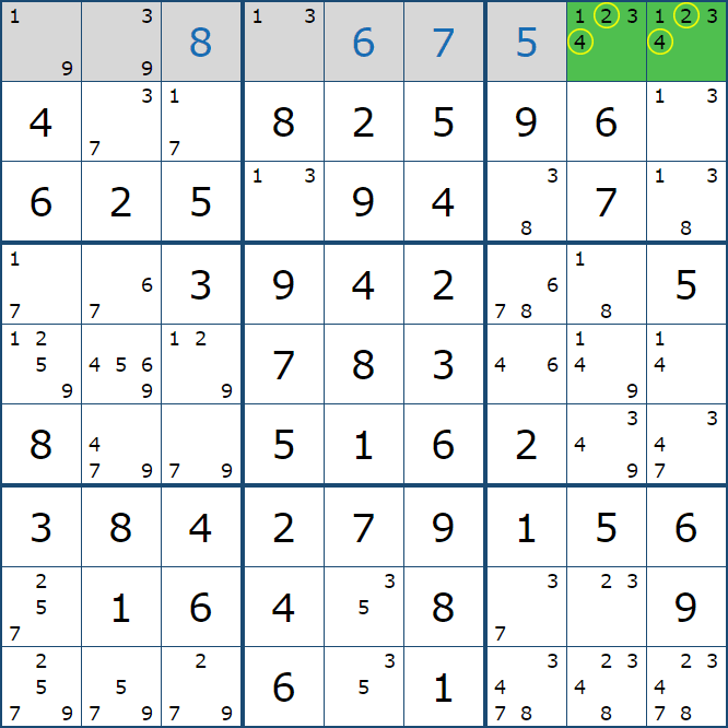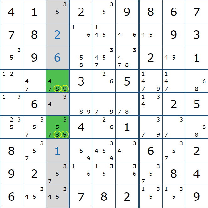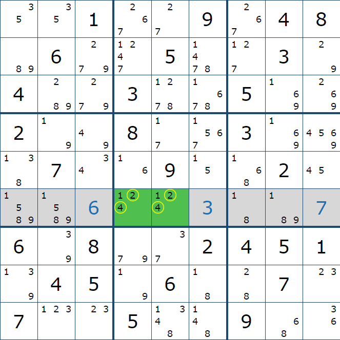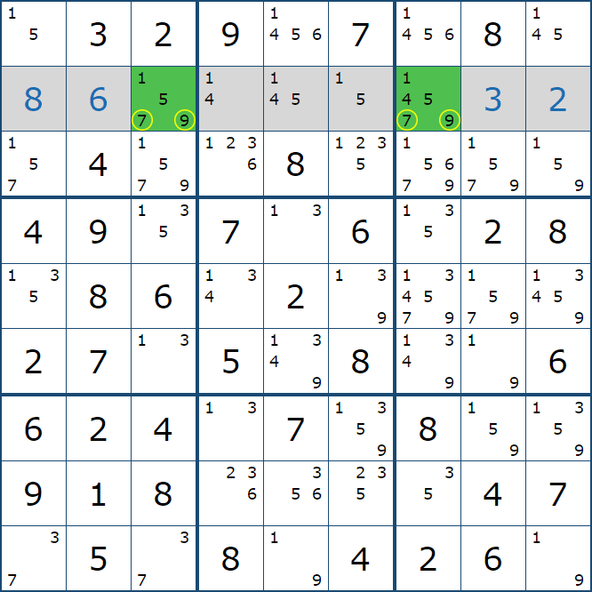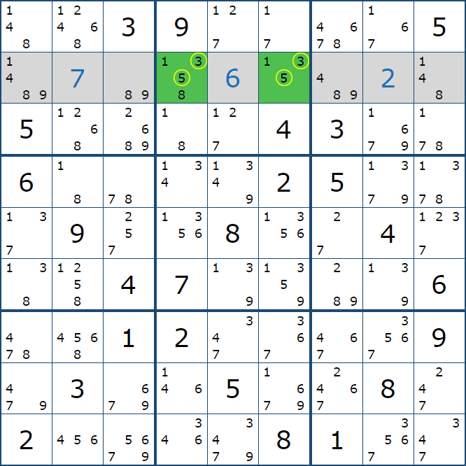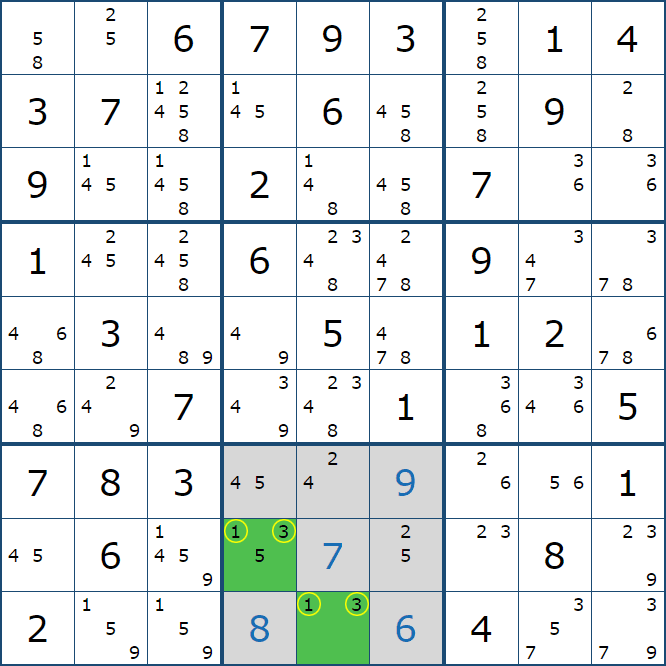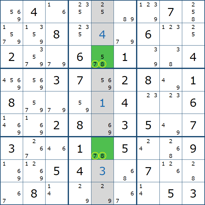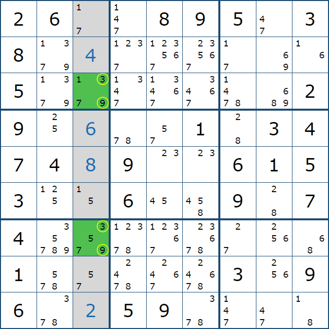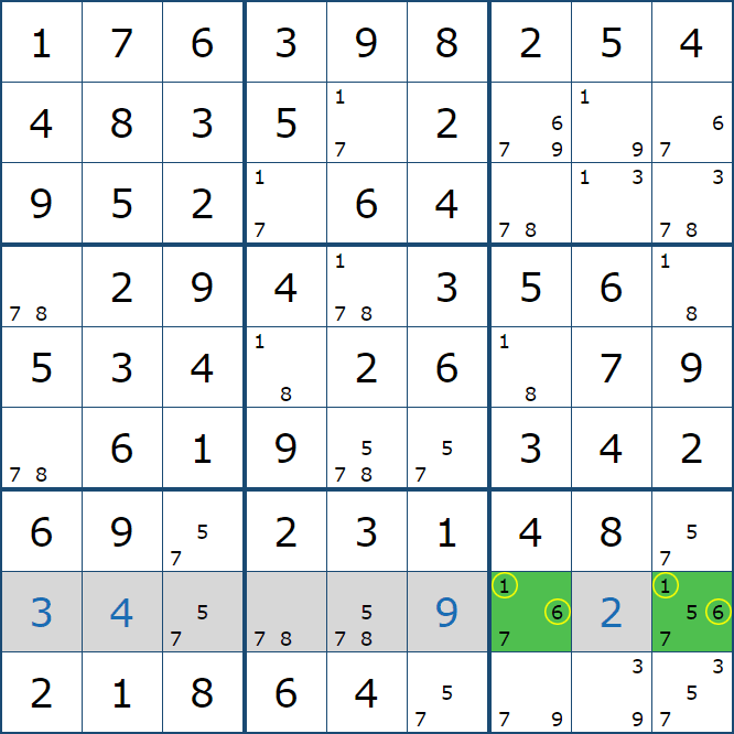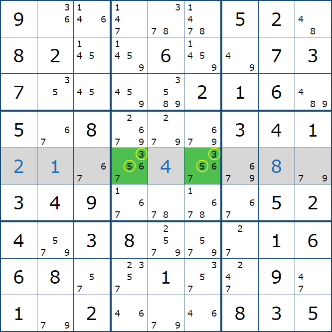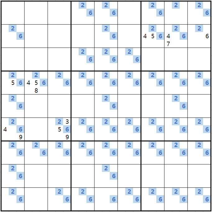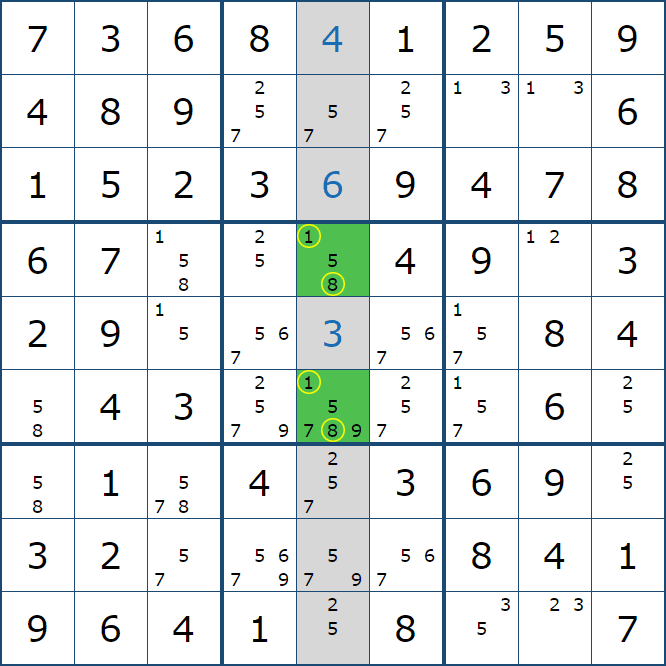 위와 같이 한셀에 후보숫자 2가 연속된 행 또는 열에 존재하는 경우 아래와 같이 두 개의 칸에 무조건 후보숫자2가 확정이 된다.