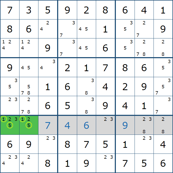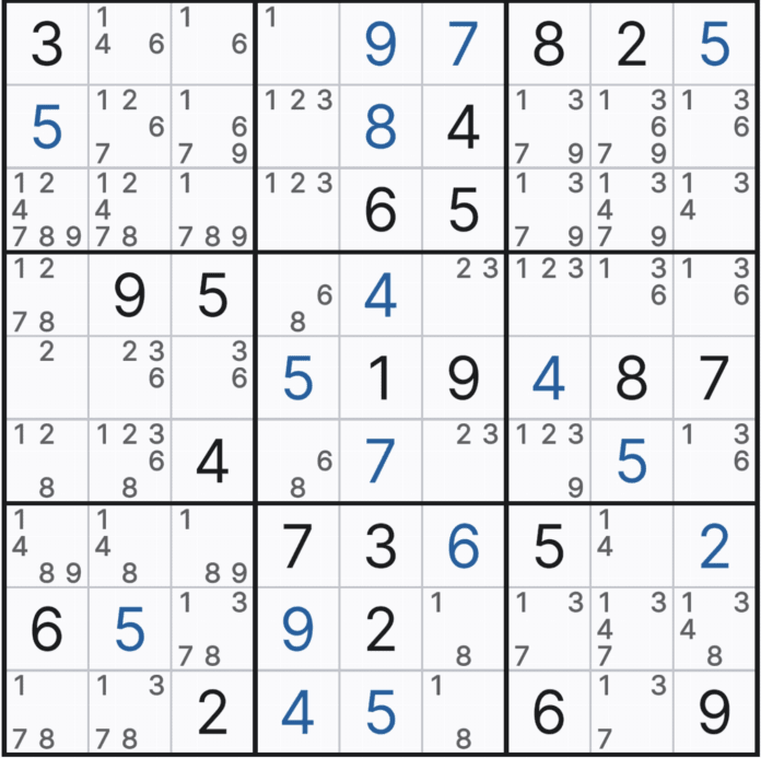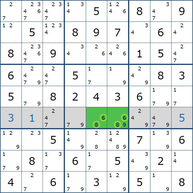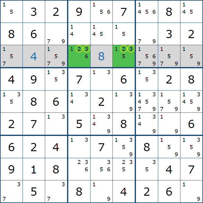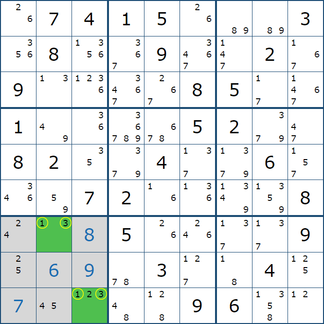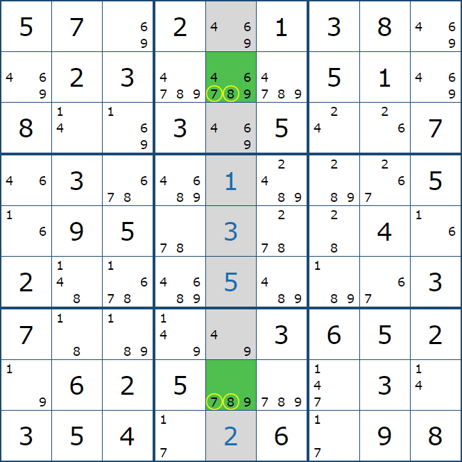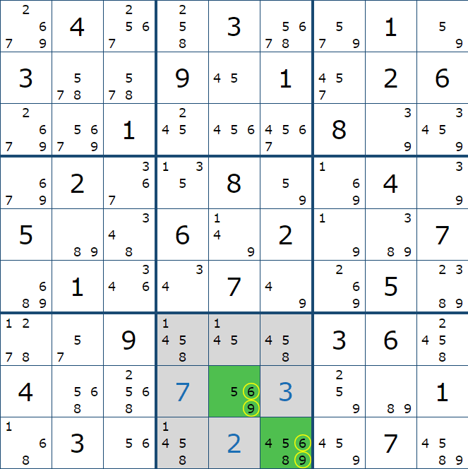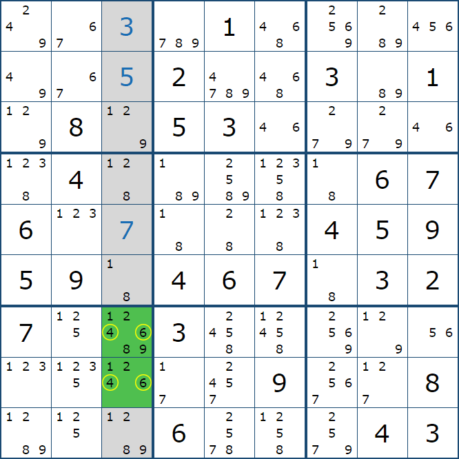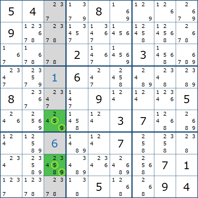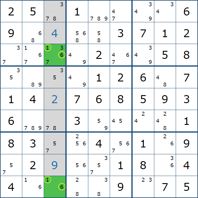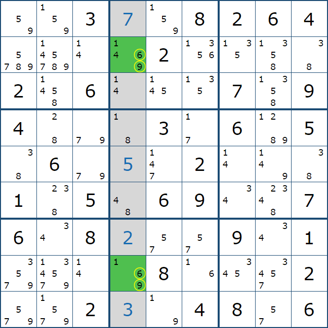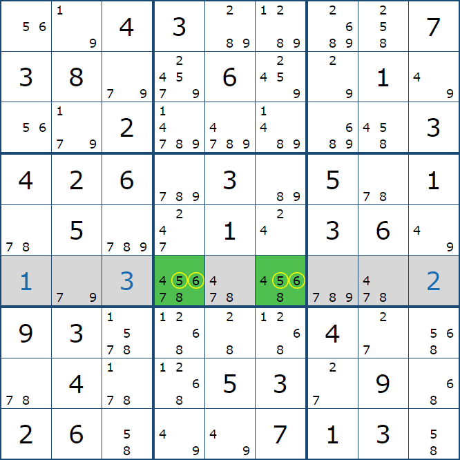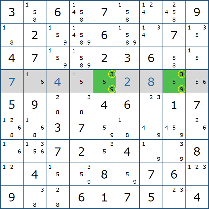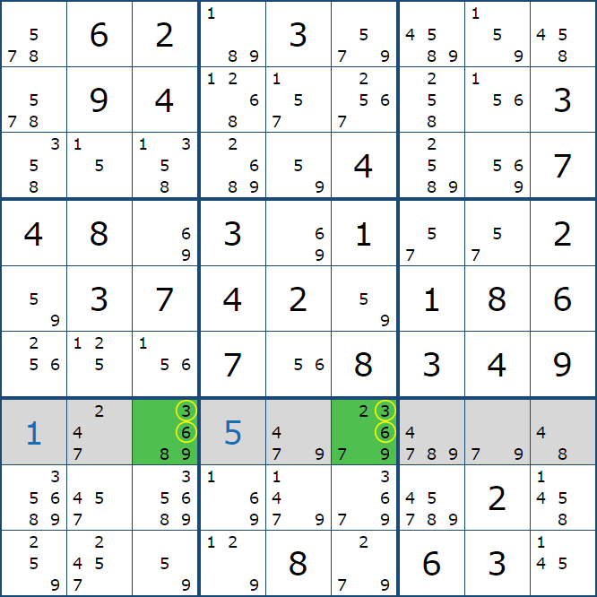 위와 같이 한셀에 후보숫자 2가 연속된 행 또는 열에 존재하는 경우 아래와 같이 두 개의 칸에 무조건 후보숫자2가 확정이 된다.