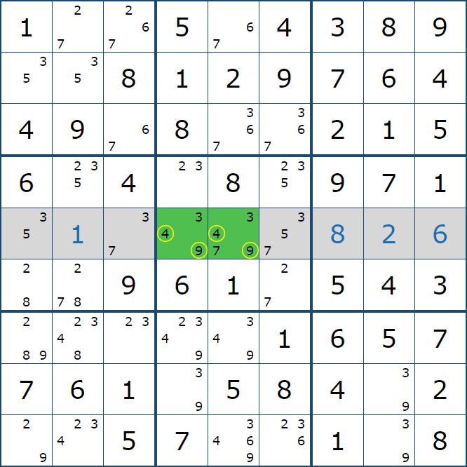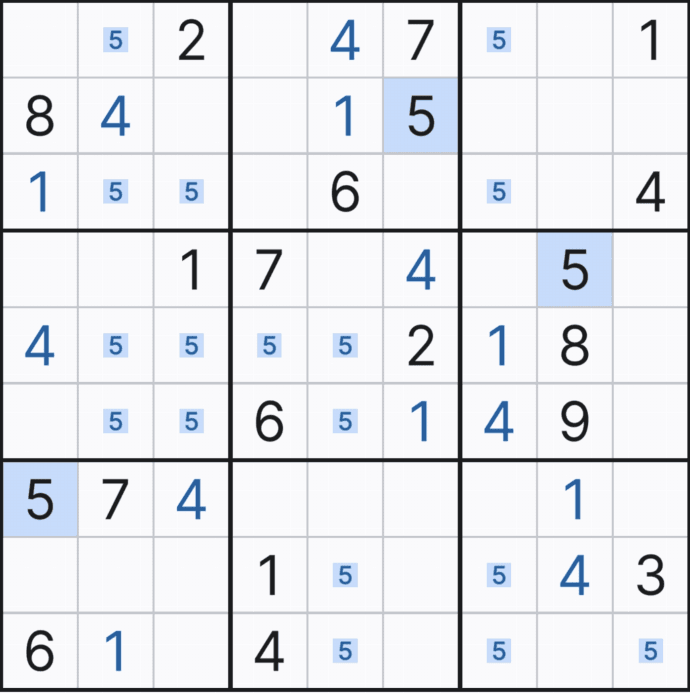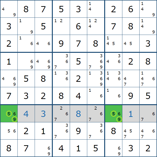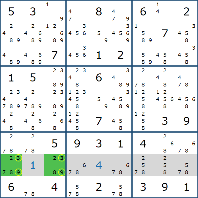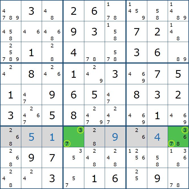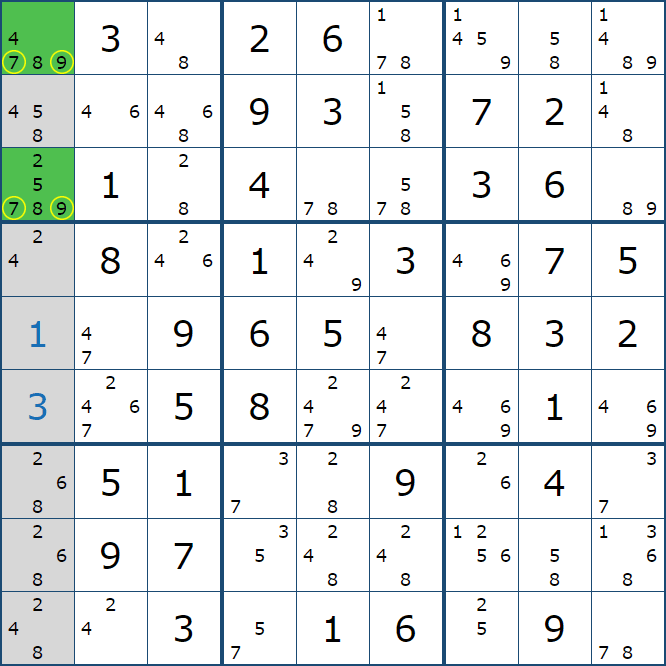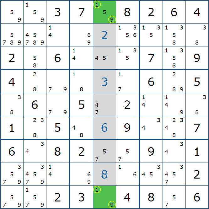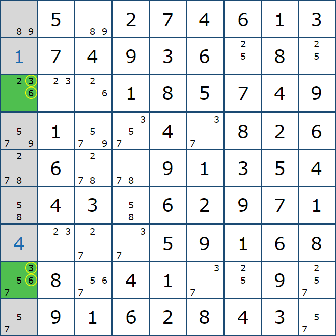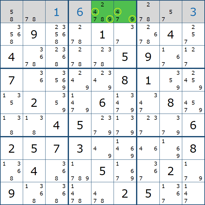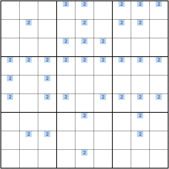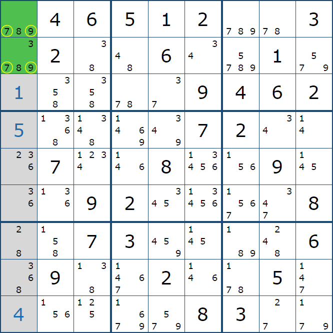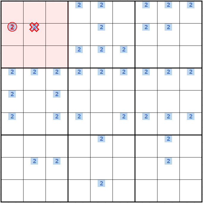 위와 같이 5행에는 (5,1)과 (5,3)에만 후보숫자 2가 존재하는 것을 알 수 있다.