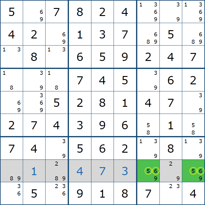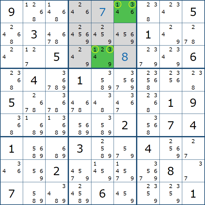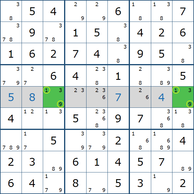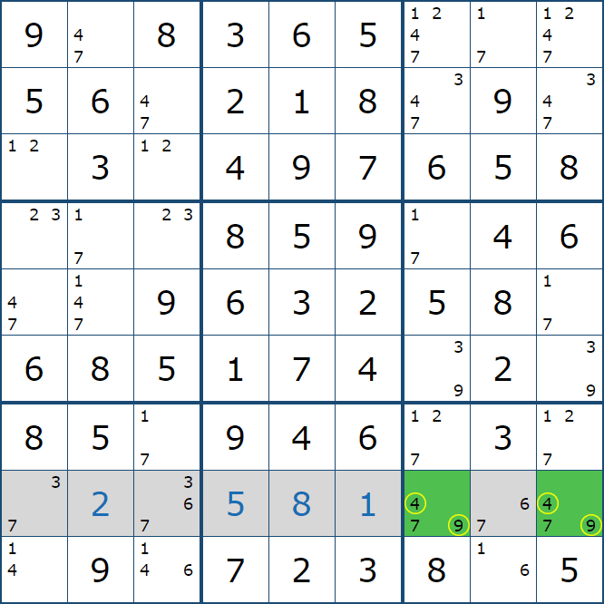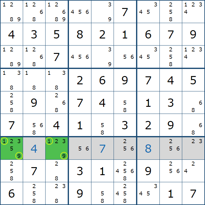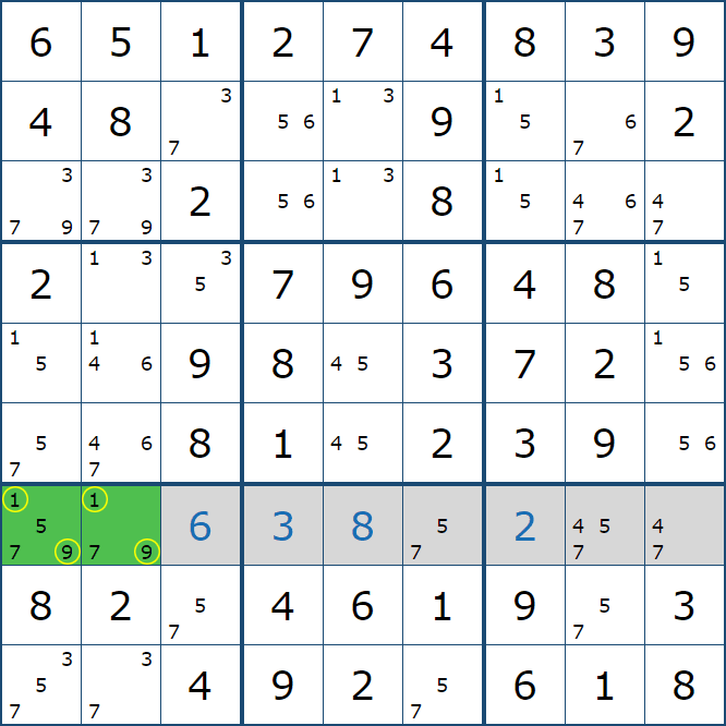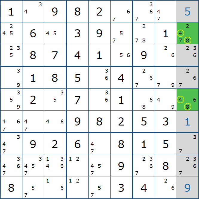 위의 예제에서 끝까지 페어 제거를 찾아보면 아래의 움짤과 같이 풀이가 이어지는데, 박스8과 박스9에서는 2개의 확정숫자를 찾을 수 있음을 알 수 있다.