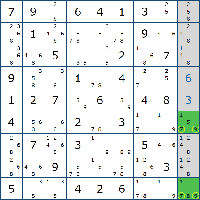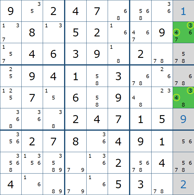 박스9의 숫자 중에 숨겨진 페어가 있는데 나는 13인지, 14인지, 34인지, 37인지 알아 보지 못해서 다른 확정숫자를 찾다 보니까 37이 '숨겨진 싱글'이었다는 것을 알 수 있었다. 실전은 의외로 기본 공식 적용하기도 빡세다.