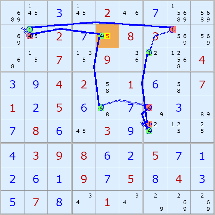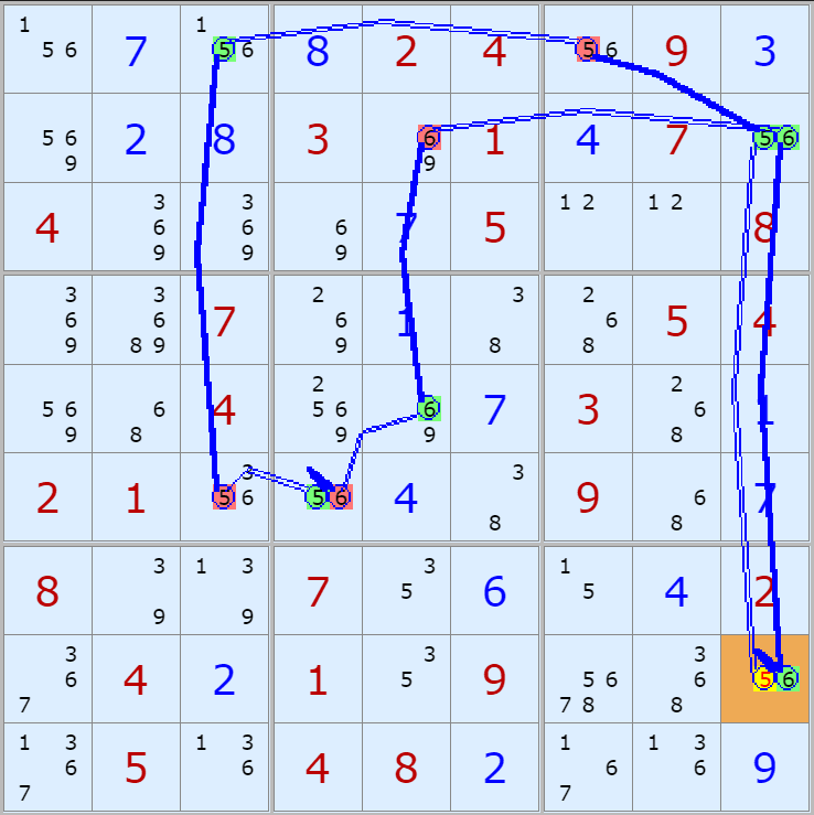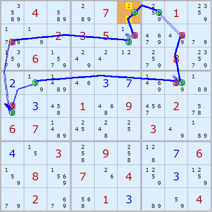 체인을 끝까지 연결하면 위의 짤과 같이 -7[B5]과 -2[B5]가 되어 B5칸의 후보숫자 모두 OFF가 되는 모순이 생기는 것을 알 수 있다. 따라서 이런 모순을 제거 하기 위해서는 -2[B5]가 삭제 되어야 한다.'는 결론을 얻을 수 있다.
