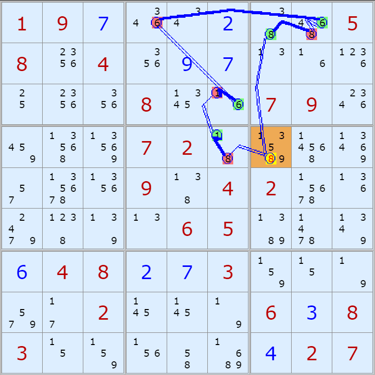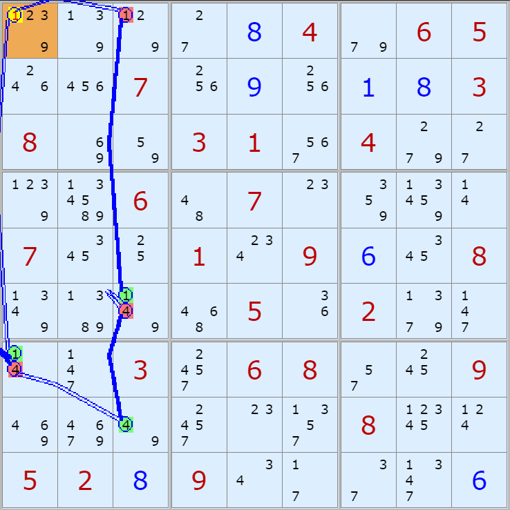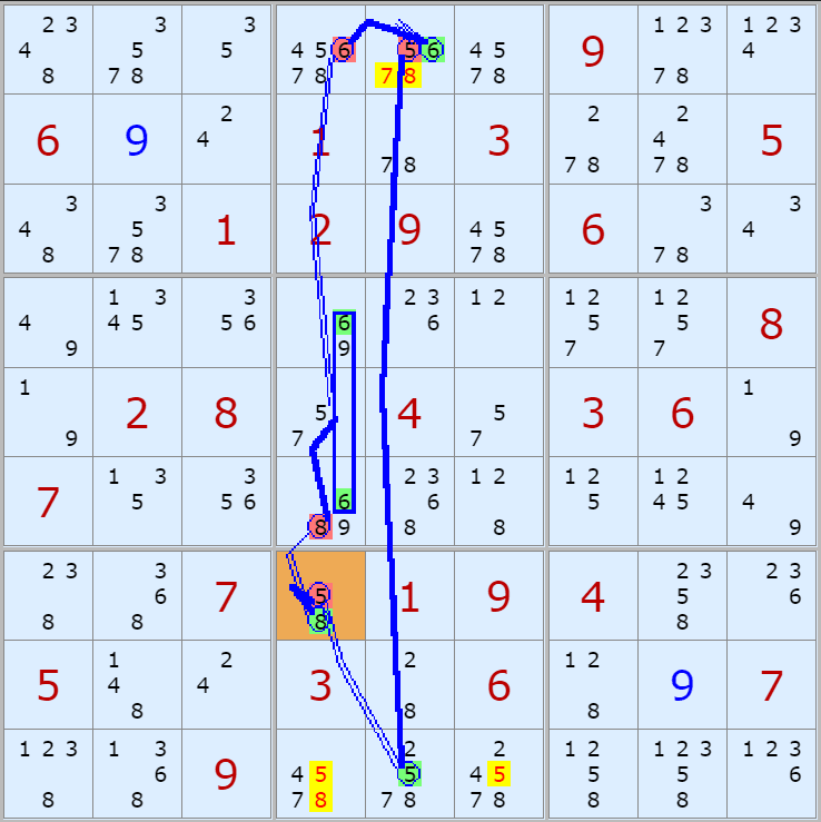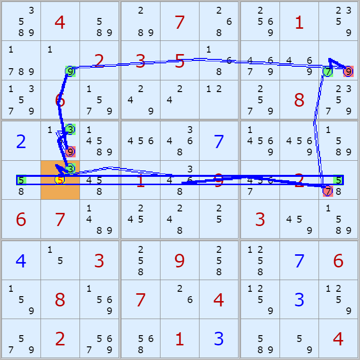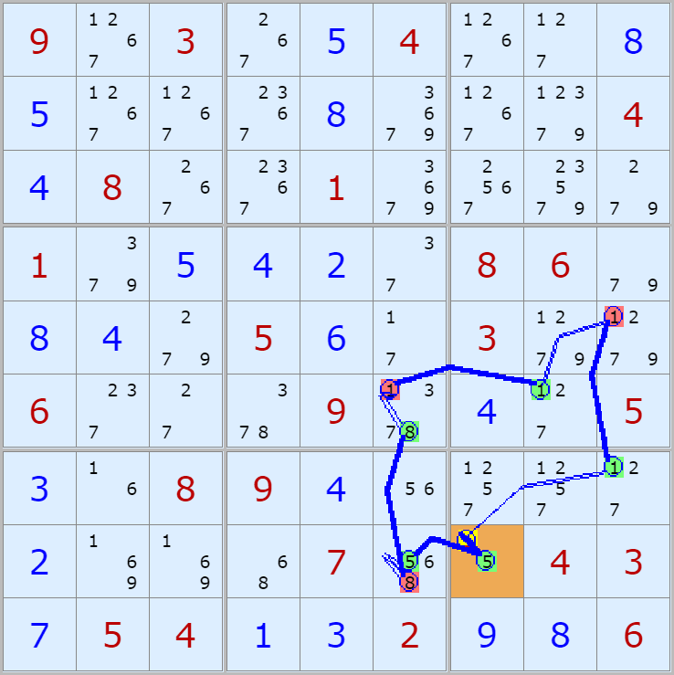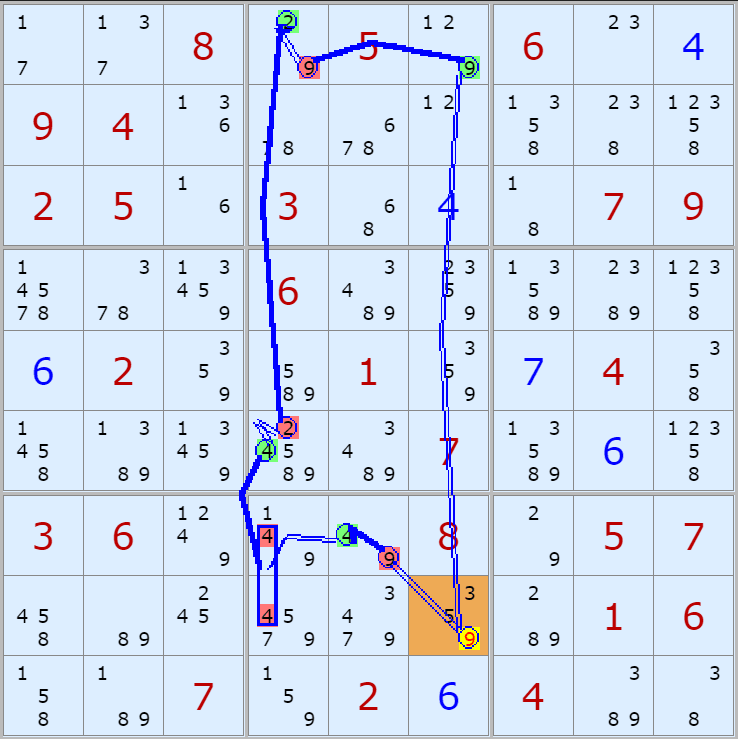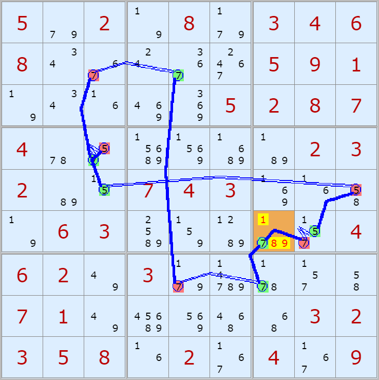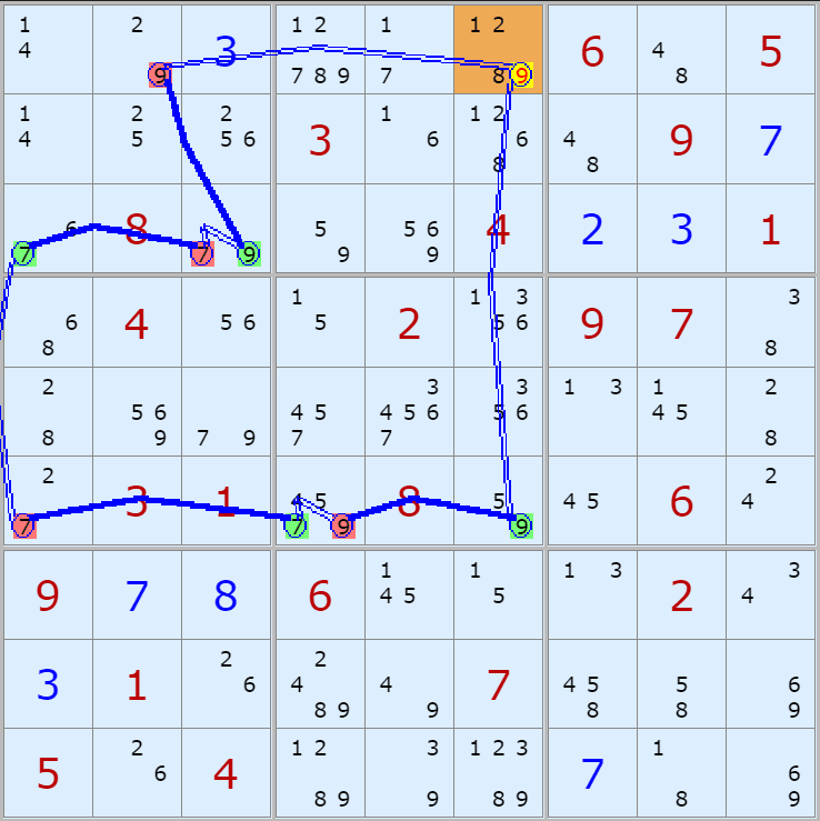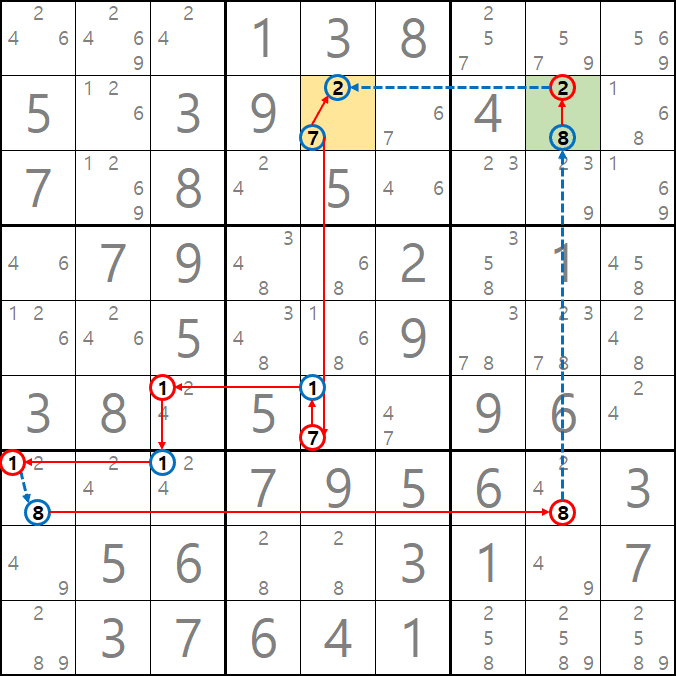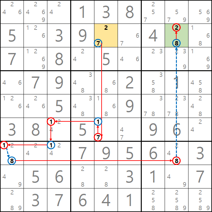 -1[E3] +1[E7] -1[B7] +8[B7] -8[J7] +9[J7] -9[F7] +9[D8] -1[D8] +1[D2] -1[E3]의 루프형 AIC가 완성되어