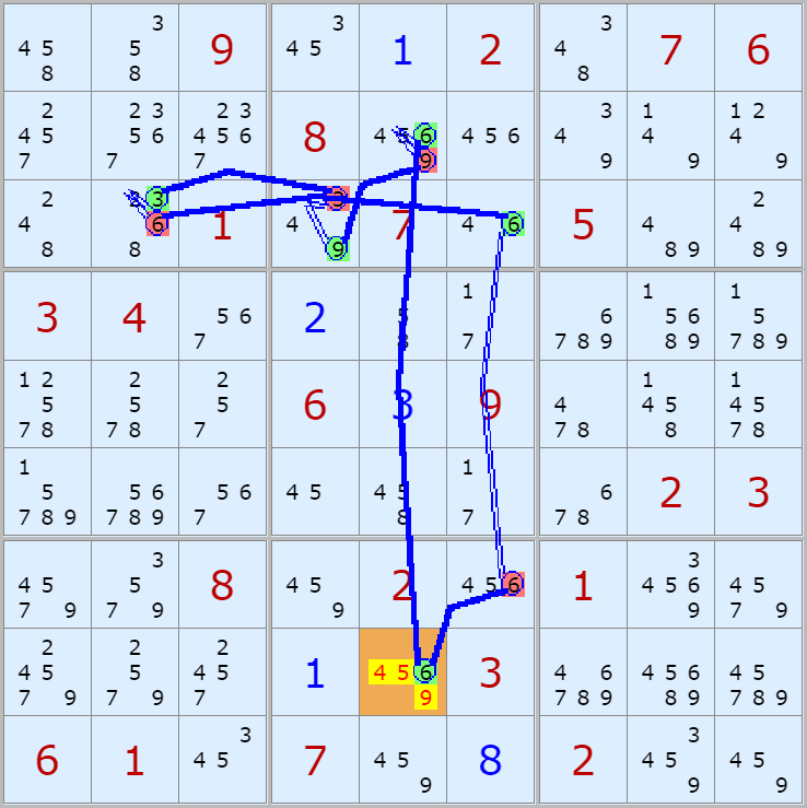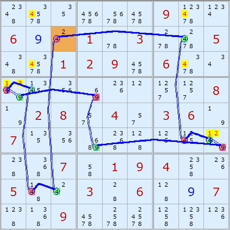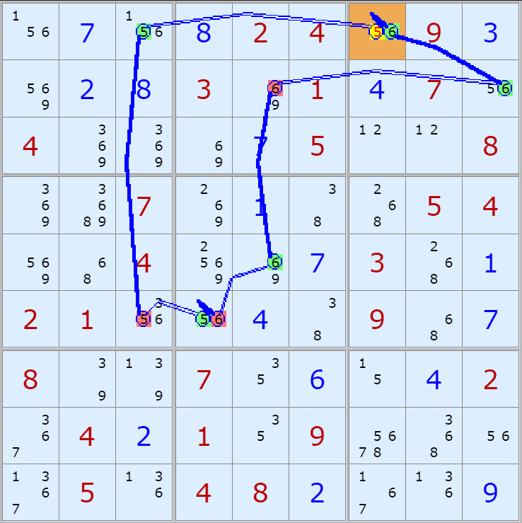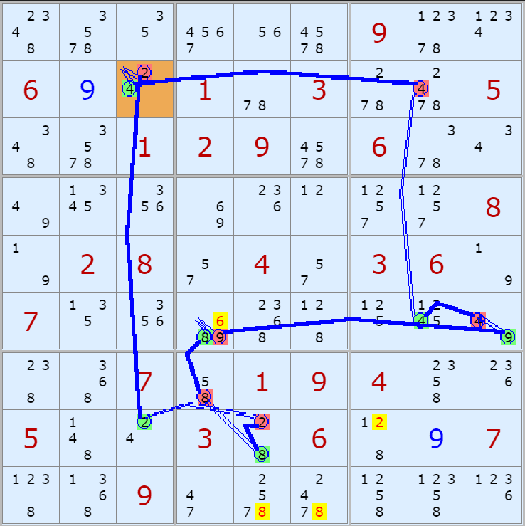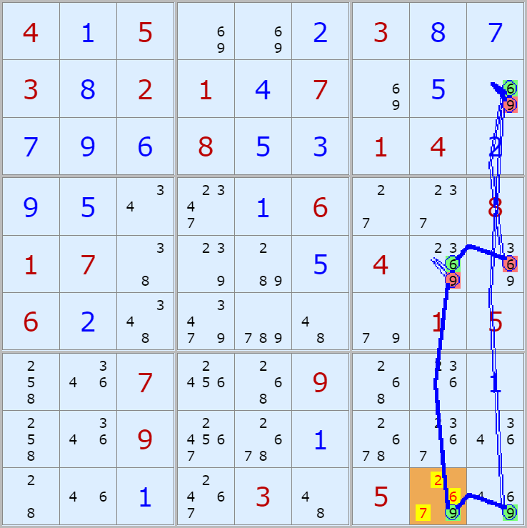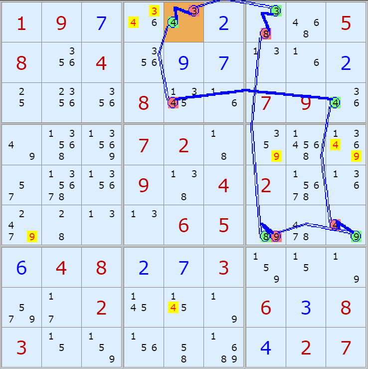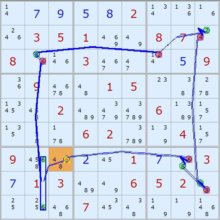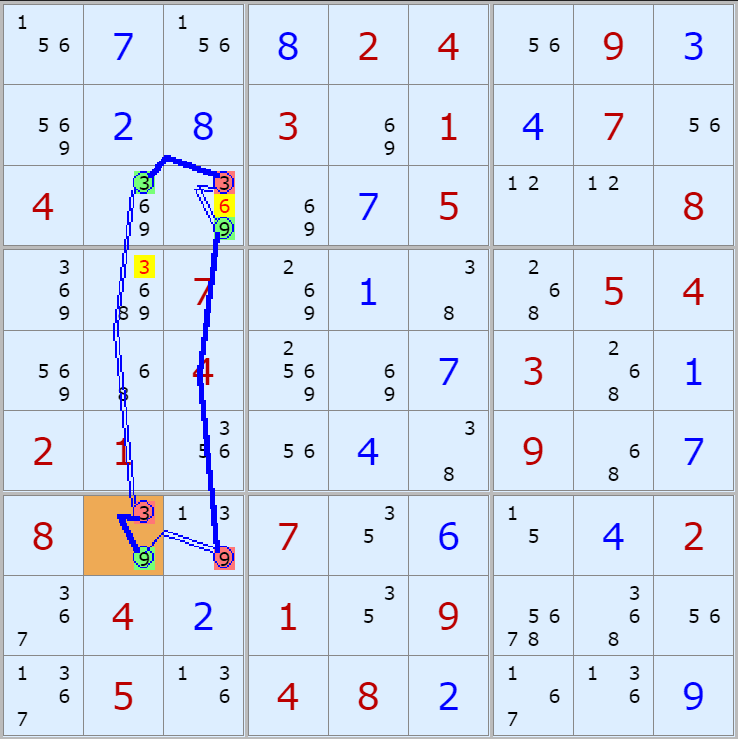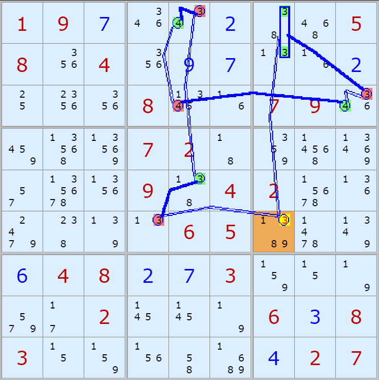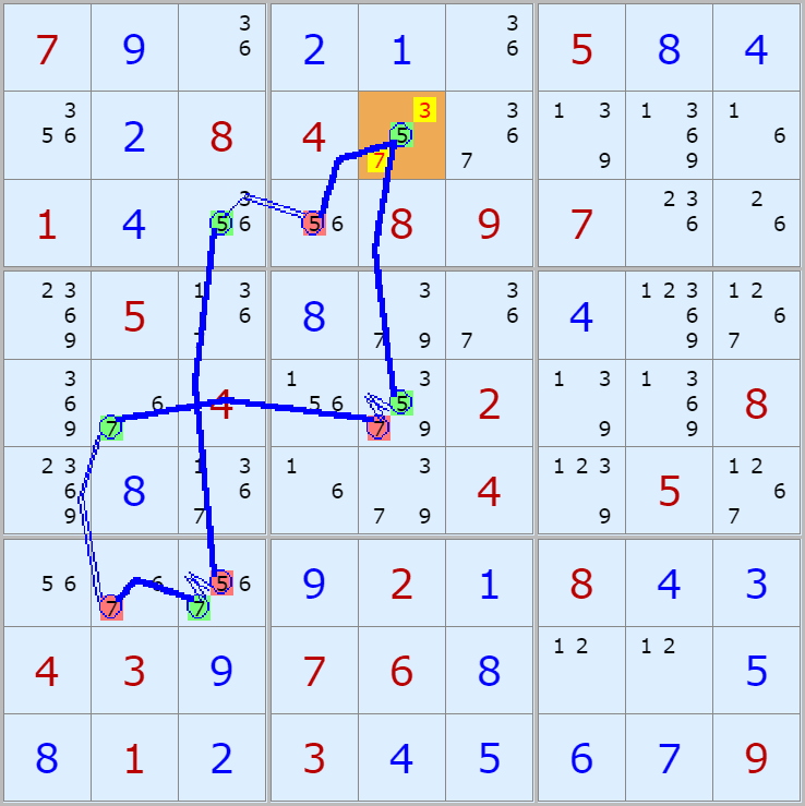 -1[E3] +1[E7] -1[B7] +8[B7] -8[J7] +9[J7] -9[F7] +9[D8] -1[D8] +1[D2] -1[E3]의 루프형 AIC가 완성되어