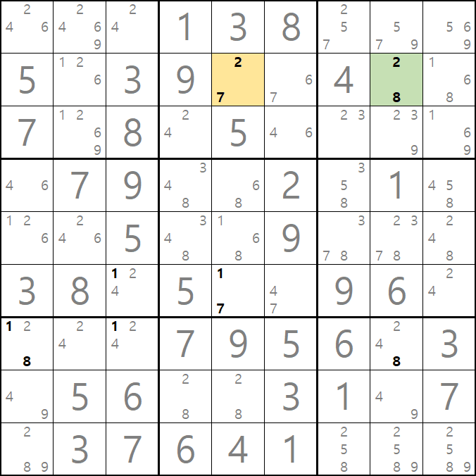 동시에 -9[F2]와 -9[F7]로 F행의 후보숫자 9가 모두 제거되는 모순이 생기므로 F7은 9가 되어야 함 -