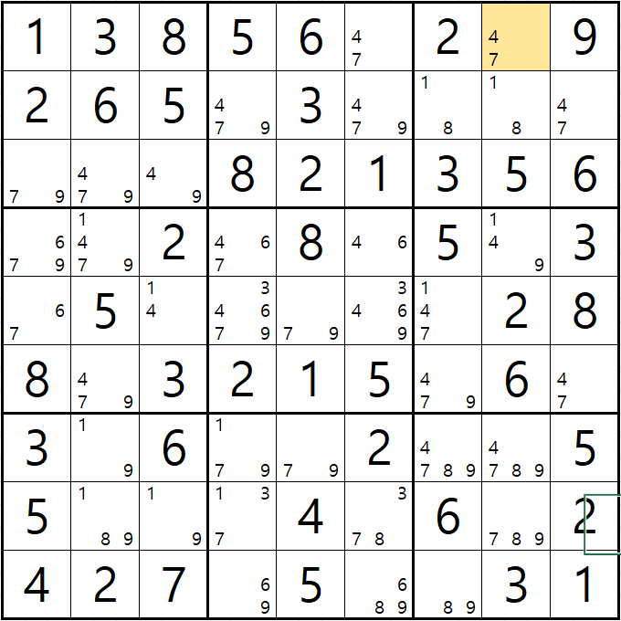 경로에 들어 있는 후보숫자 4[D8], 8[G7], 9[G7] 3개를 제거할 수 있다.