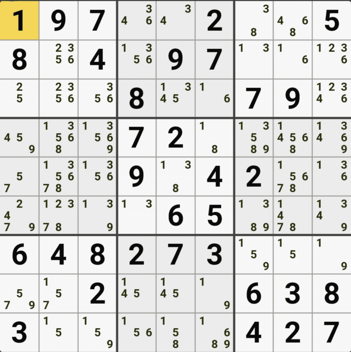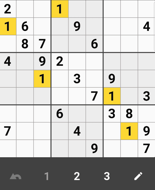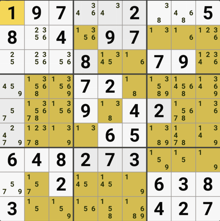 1. 숫자를 클릭하고 후보숫자를 넣으면 위와 같이 칸 전부가 노란색으로 변해서 명시성은 높은데 후보수 인식률이 떨어진다. 특히 확실한 싱글, 페어, 트리플이 잘 안 보인다. (12월 10일 추가... 칸 전체에 색이 칠해져서 인식률이 떨어진 게 아니었다. 나의 실력이 부족했었다~.)