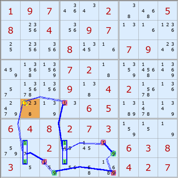 아직 100% 다 파악은 못했지만 풀이 방법은 기본공식부터 심플컬러링 및 X체인, XY체인까지는 위의 움짤과 같은 풀이법이 제공 되고, 좀 유니크한 3D 메두사 그룹 X체인 같은 초고급은 아직 발견을 못했다. 그래도 XY체인까지면 내 생각에는 99%의 스도쿠 풀이법을 제공한다고 생각한다.