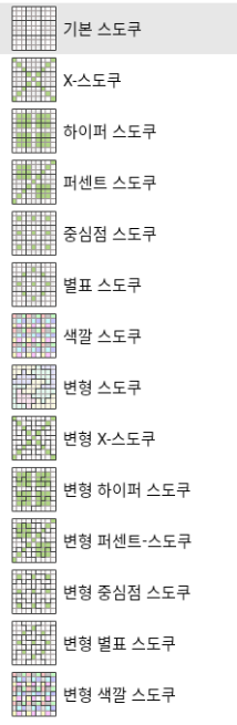 4. 클래식 스도쿠 외에 아래 그림처럼 스도쿠 종류가 많아서 클래식이 좀 질릴 때, 병행해서 하면 흥미 유지가 오래 될 거 같다.