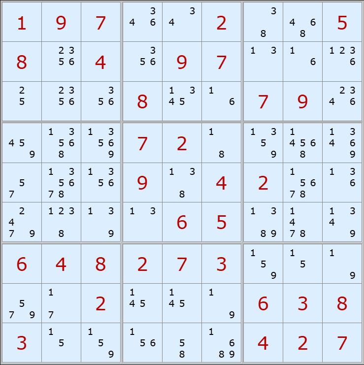 반대로 위에서 설명한 풀이법이 있어서, 길을 좀 헤메다가 스도쿠 스킬을 늘리기에는 매우 좋다.