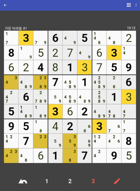 스도쿠에 빠져든지 2달이 막 지나는 지금 현재까지 10가지 정도의 앱을 광고 보면서 써보고 2개의 앱을 유료결제로 사용하다가 전문가 난이도인데 뭔가 맥없이 풀리는 것 때문에 조금 스도쿠의 맛이 없어지고 있을 때, Andoku3이라는 앱을 써보고 마음에 딱 들었다.