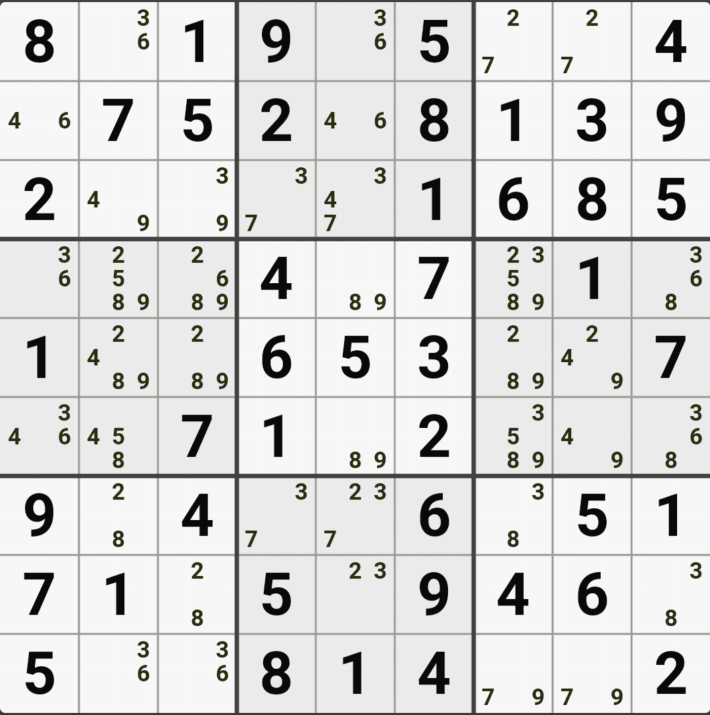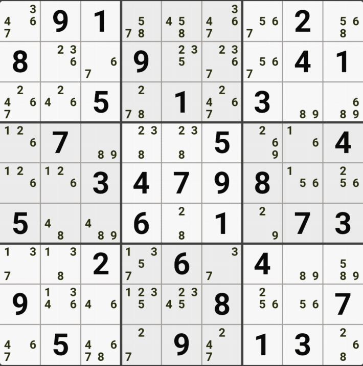9열을 보면 후보숫자 9는 C9와 G9에만 존재하는 잠긴 형태인 것을 알 수 있다. 즉, 위치를 특정할 수는 없지만 C9 또는 G9 두 칸중 한 칸에는 무조건 9가 들어가야 하기 때문에 모순된 상황을 회피하기 위해서는 8[C9], 8[G9] 2개의 후보숫자는 제거 되어야 한다.