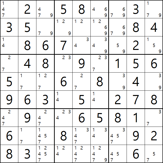 박스2와 B행을 보면 후보숫자 7은 B4와 B6에만 존재하는 잠긴 형태인 것을 알 수 있다. 즉, 위치를 특정할 수는 없지만 B4 또는 B6 두 칸 중에서 한 칸에는 무조건 7이 들어가야 하기 때문에 모순된 상황을 회피 하기 위해서는 2[B4], 2[B6] 2개의 후보숫자는 제거 되어야 한다.