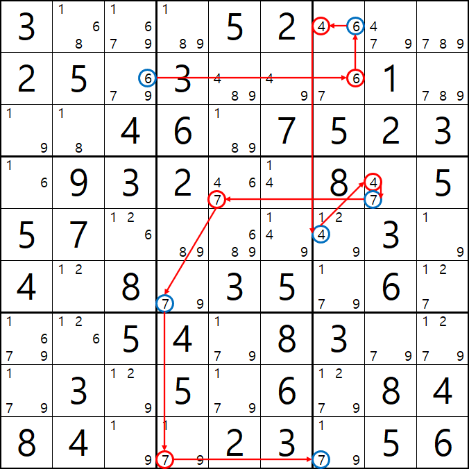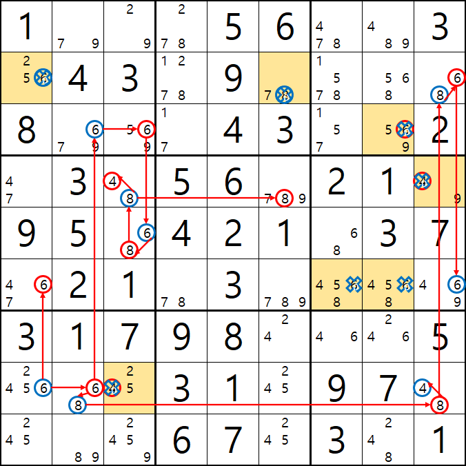 모두 스트롱 링크로 연결이 되기 때문에 결과는 삭제되는 후보숫자와 같은 색을 가진 후보숫자는 모두 제거되고 반대색을 가진 후보숫자는 해가 되는 것을 알 수 있다.
