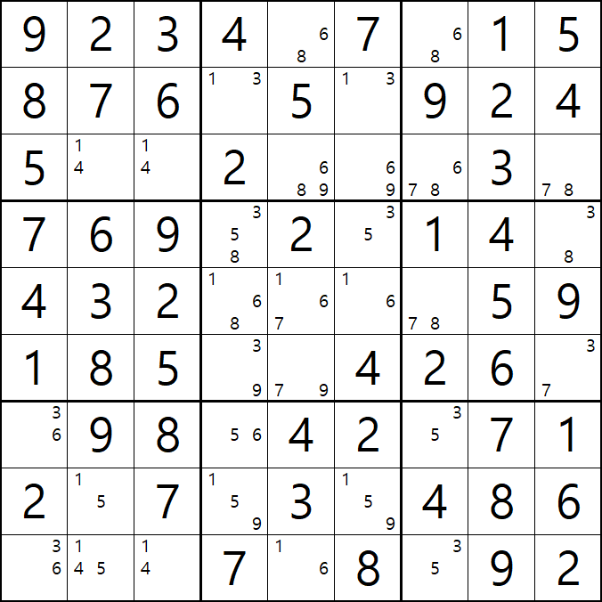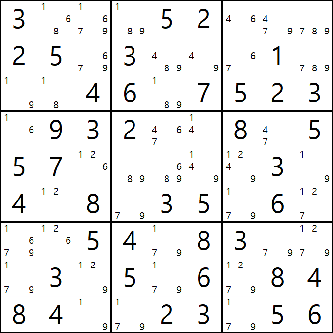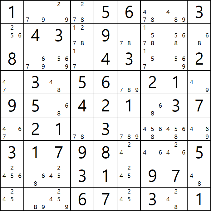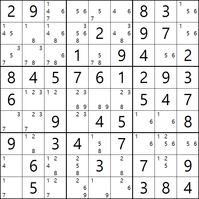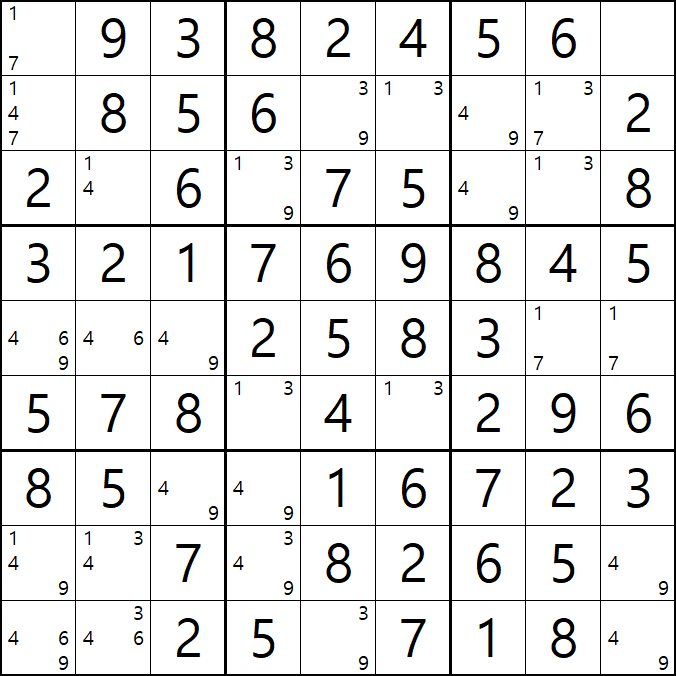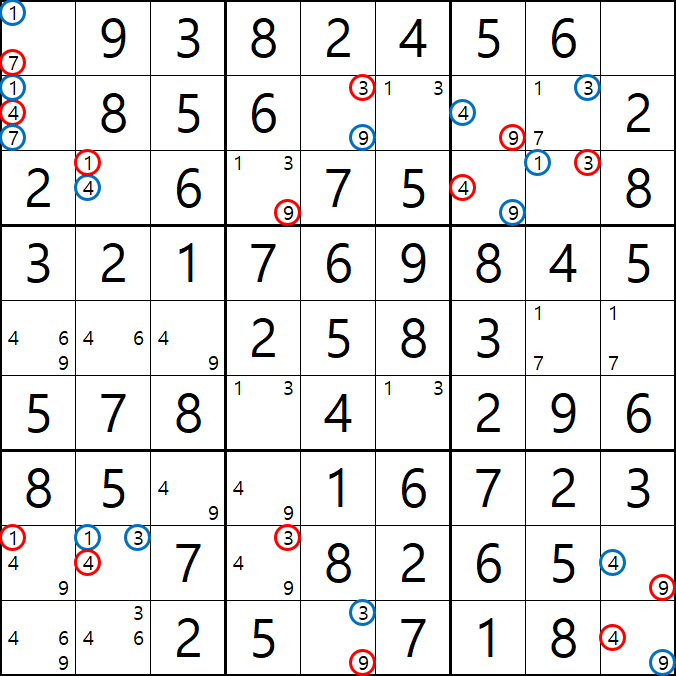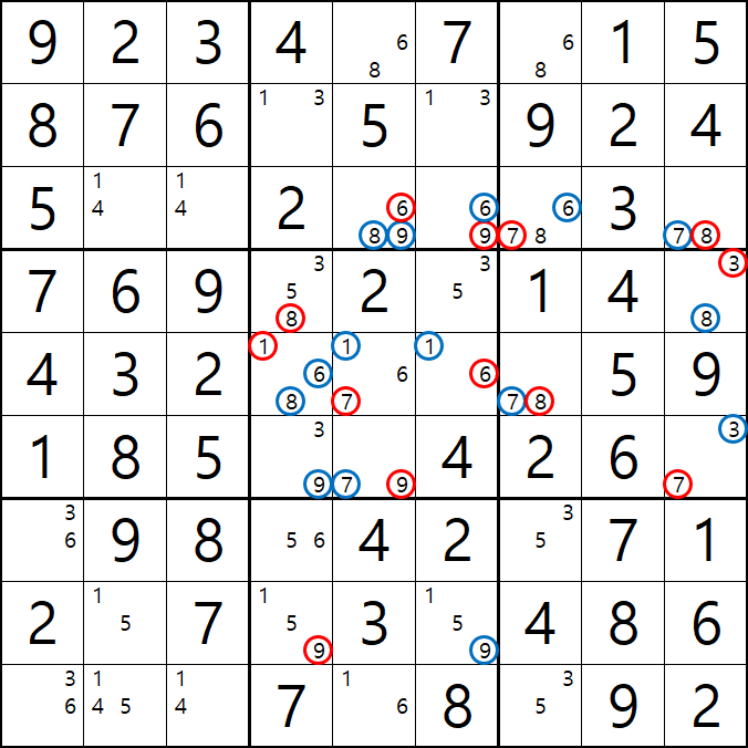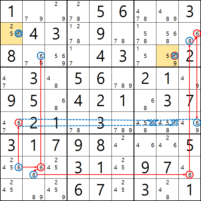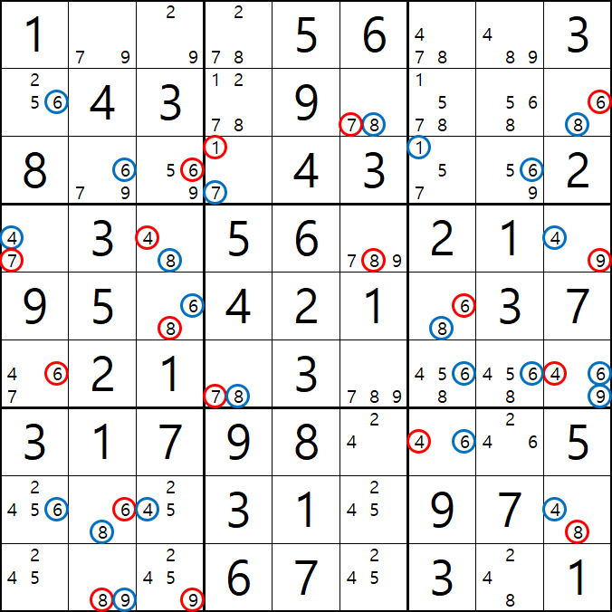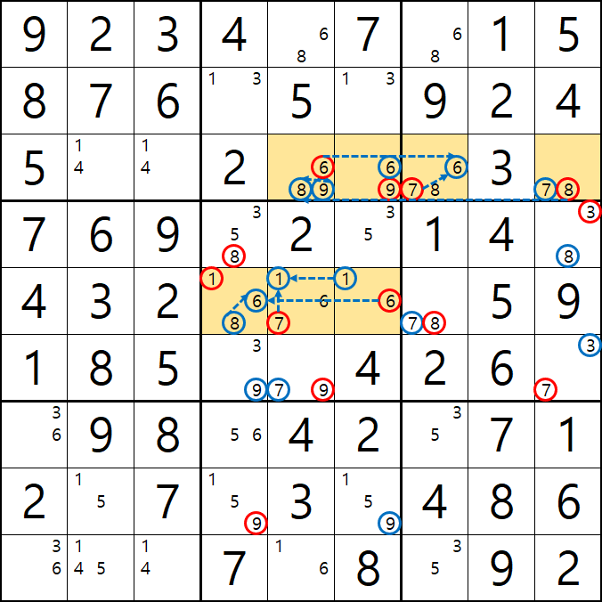 음. type6 << 이건 올릴까 말까 고민을 많이 했다. 나도 원리를 정확히 이해하지 못했기 때문인데, 공식처럼 알아두면 유용할 거라 생각해서 올린다. 설명이 부족하고 이해가 되지 않으면 패턴을 외워서 써먹자!! 칸안의 후보숫자는 2~4개까지 가능하지만 개념이 헷갈릴 수 있어서 2개 짜리만 올린다.