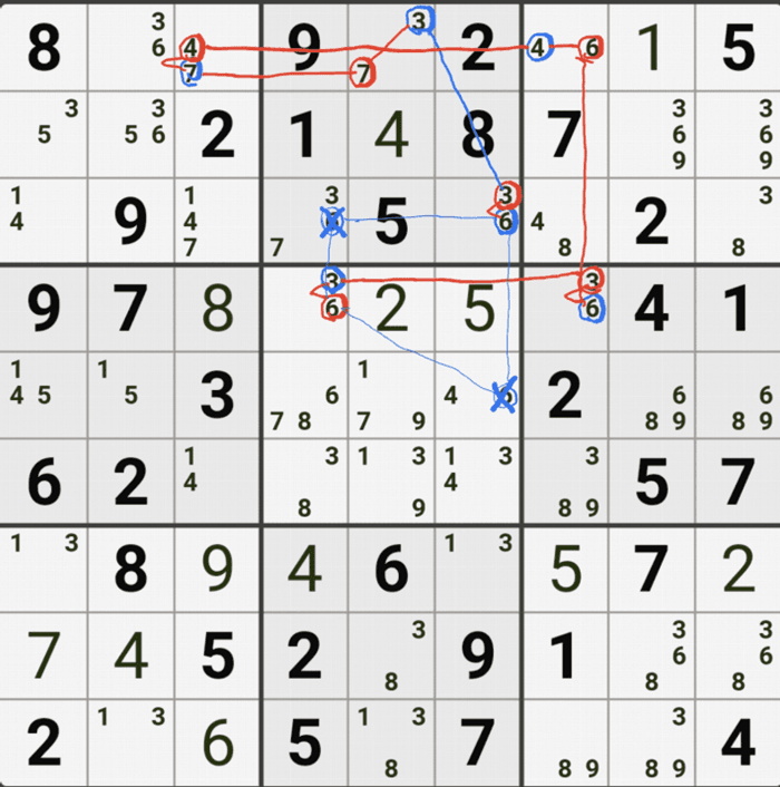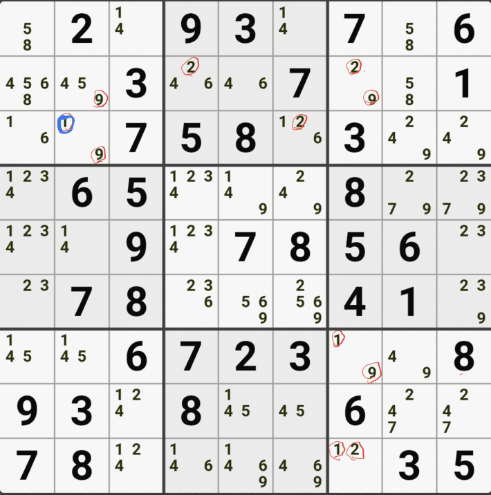 자꾸 말하지만 익숙해질 때까지 문제 DIY가 가능한 스도쿠 솔버 사이트나 앱에서 여러번 ON OFF만 표기하면서 추적하는 연습을 하자. 숫자가 많아지면 화살표 긋다가 늙어 죽을 수도 있다.