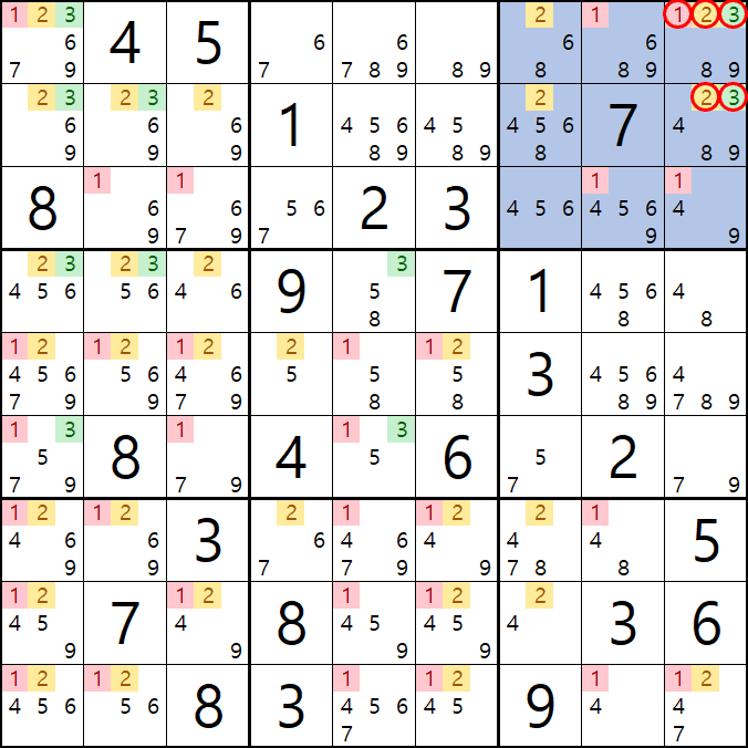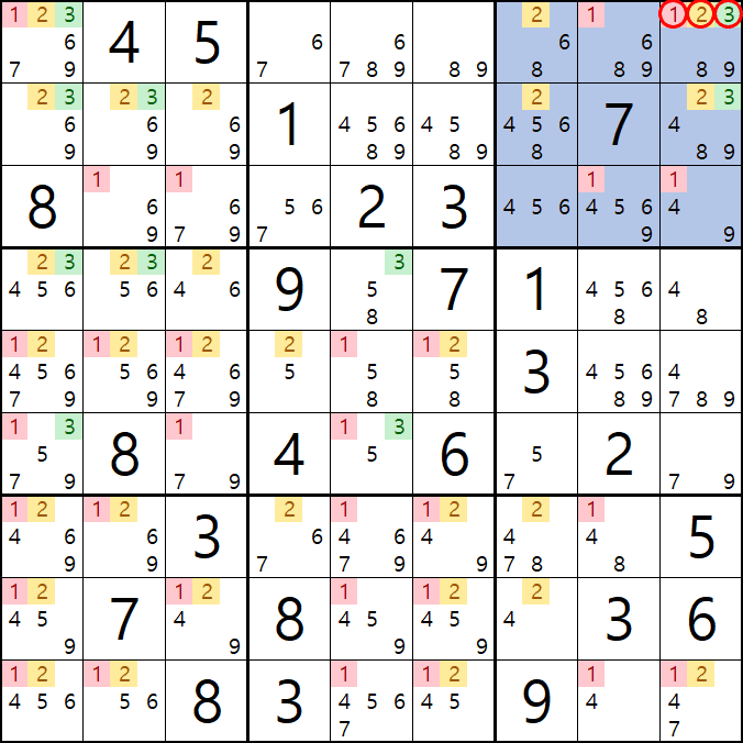 조건 1. L자의 중심이 되는 피벗이 되는 칸은 트리플을 이루는 후보숫자 XYZ 3개가 모두 포함되어야 한다. (위의 움짤로 보면 박스 3의 1/2/3[A9]이 조건을 만족한다.)