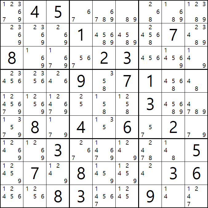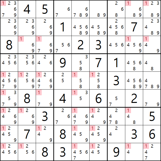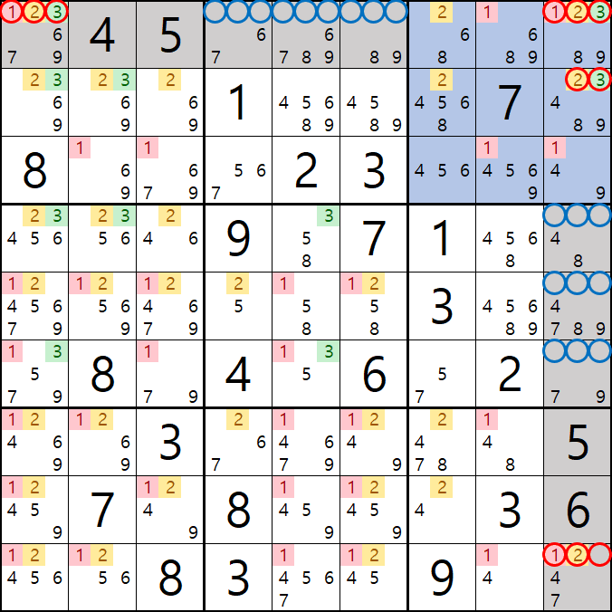 6/7/9[A1], 8/9[A9], 4/7[I9] 7개의 후보숫자를 제거한 후에 다른 공식 적용없이 풀하우스만 찾아서 끝까지 깼다.