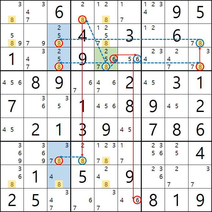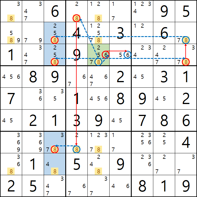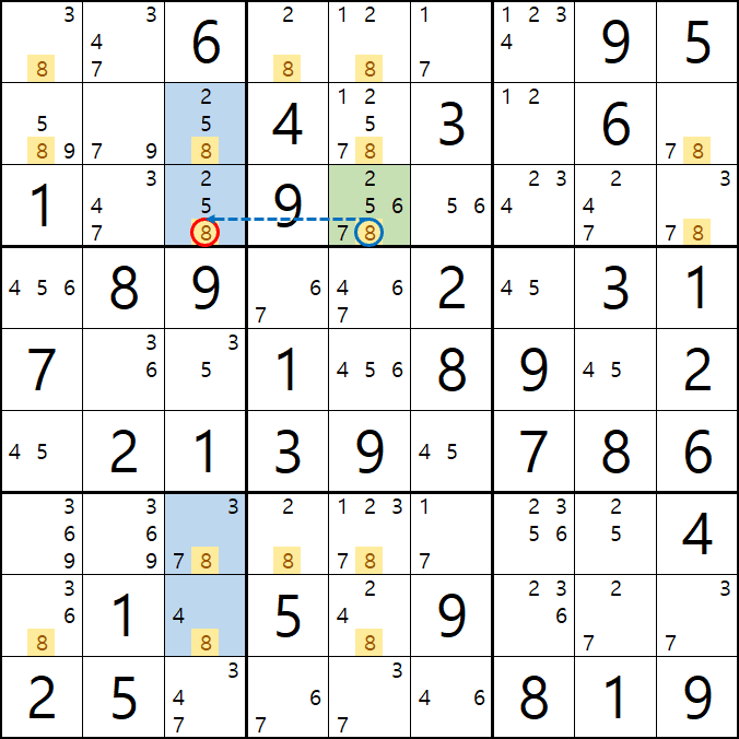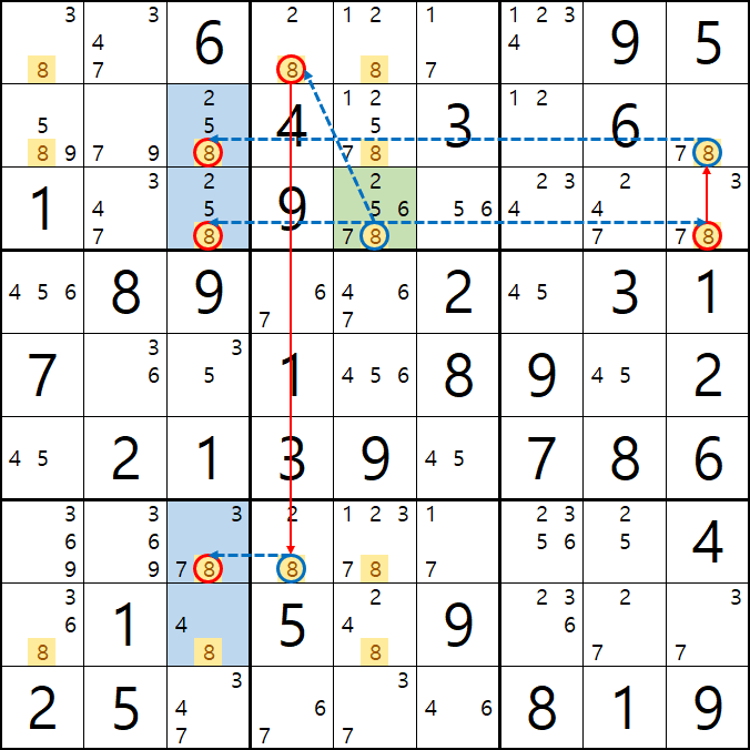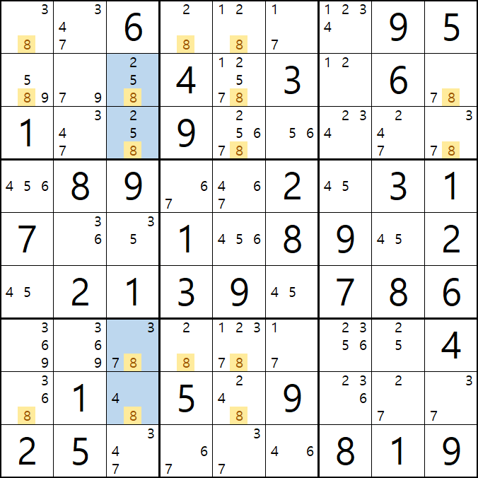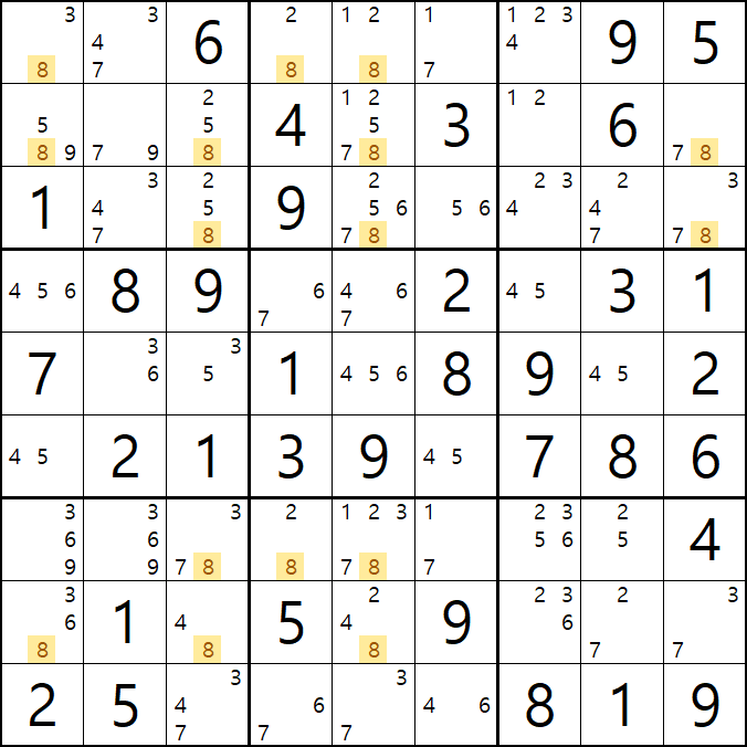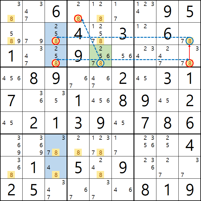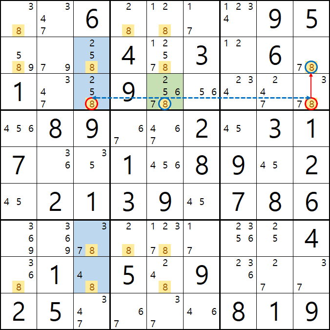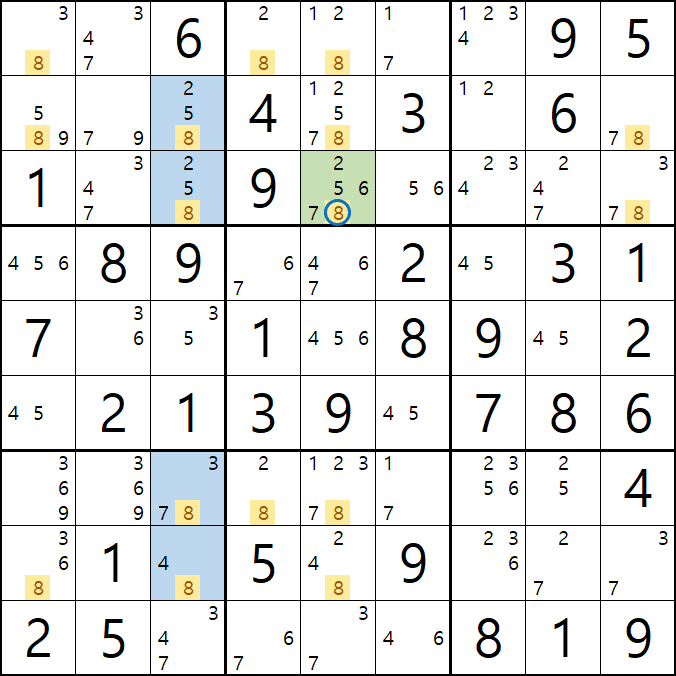 1. 위의 움짤을 보면 8[A3], 8[C3], 8[G3], 8[H3] 4칸에 존재하고 있는데, 스도쿠 제 1규칙에 따라 4칸 중 1칸에는 반드시 8이 들어가야 하는 것을 알 수 있다.