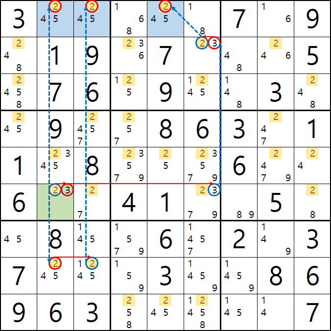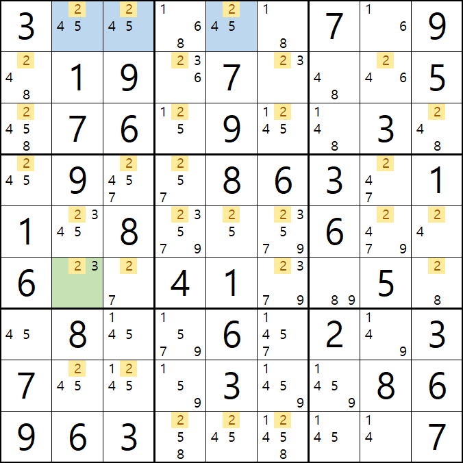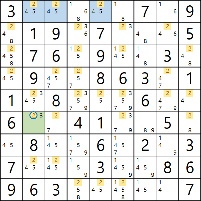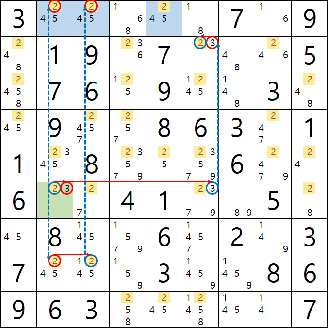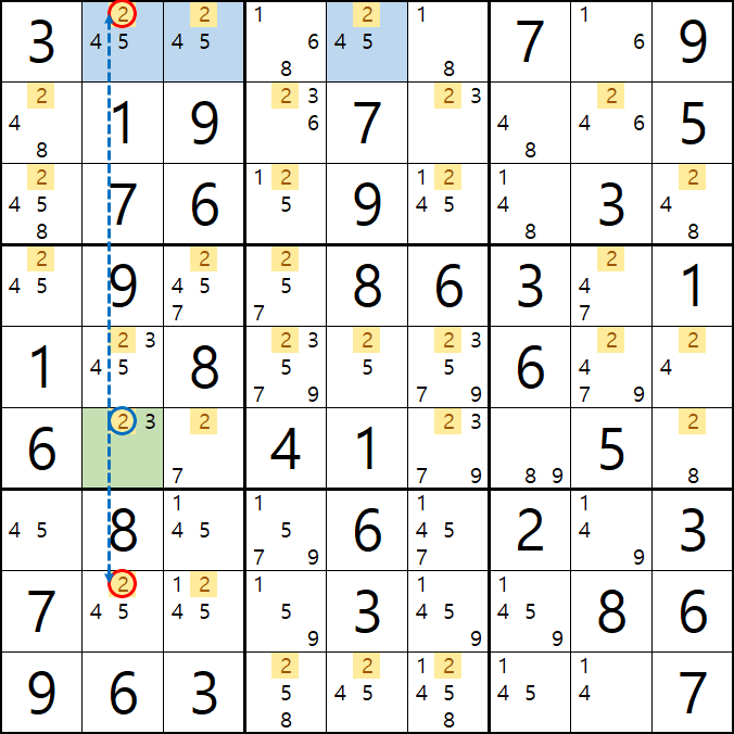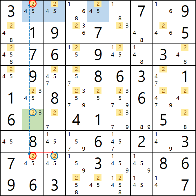 1. 위의 움짤을 보면 2[A2], 2[A3], 2[A5]에 존재하고 있는데, 스도쿠 제 1규칙에 따라 3칸 중 1칸에는 반드시 2가 들어가야 하는 것을 알 수 있다.