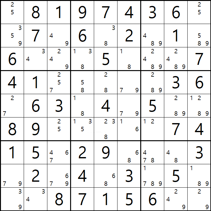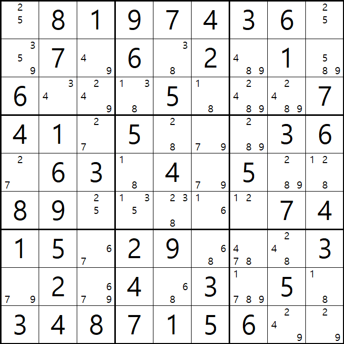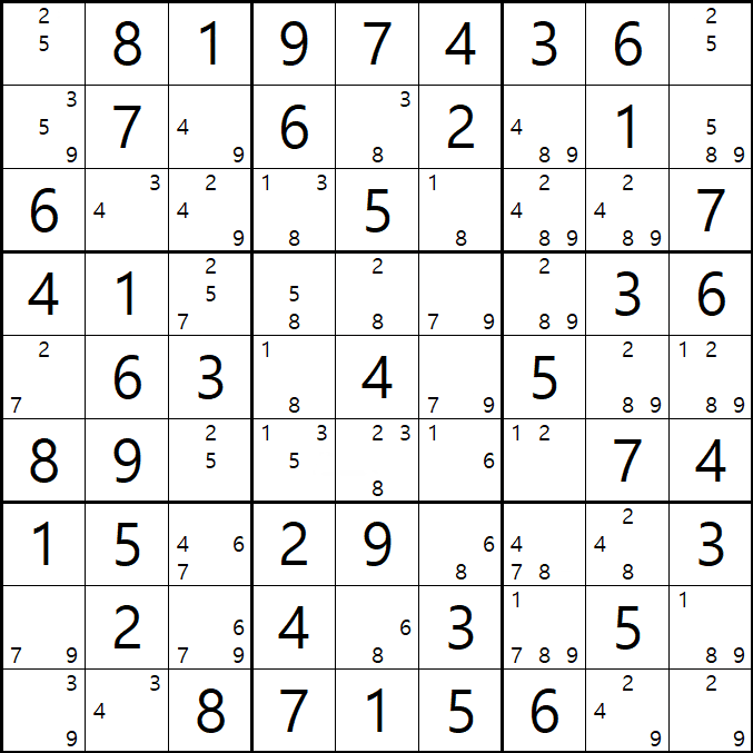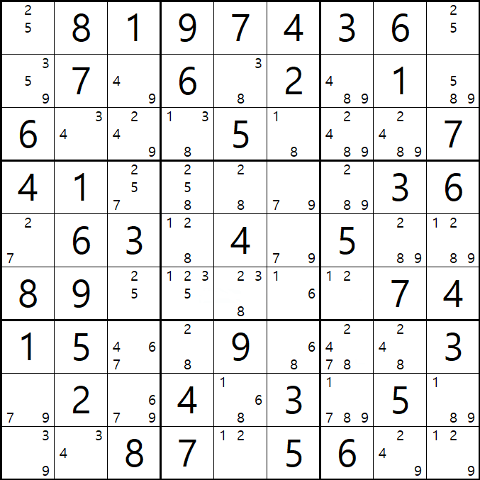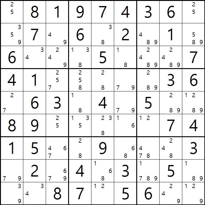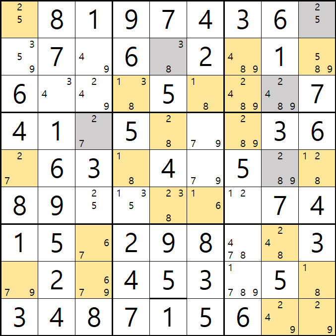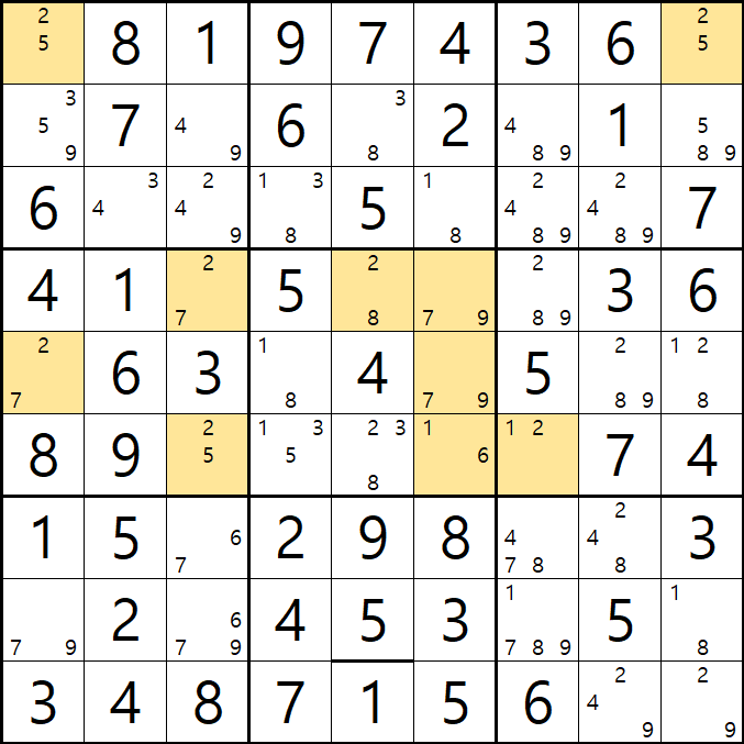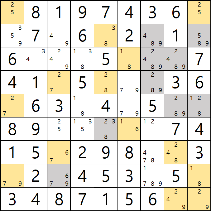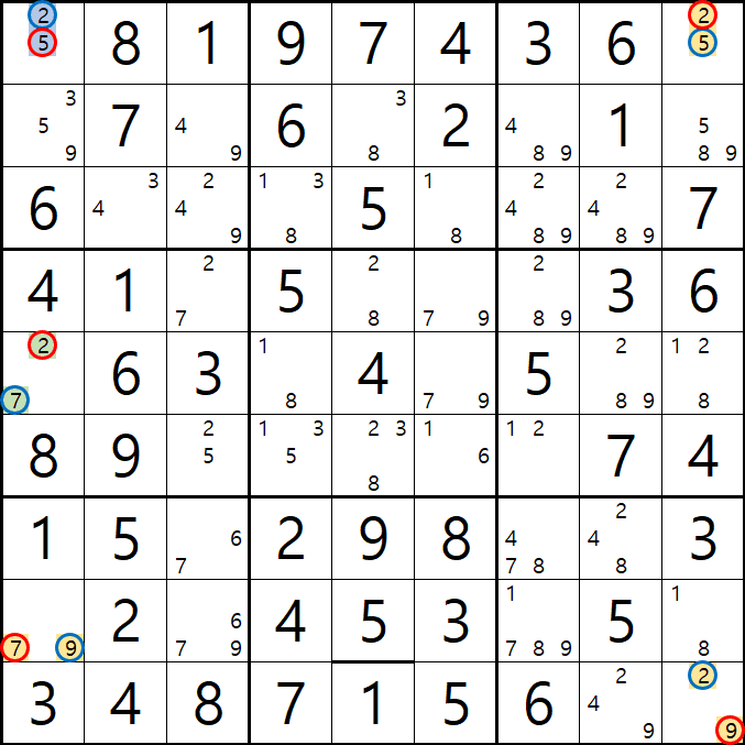 그래서 우리는 XY체인 찾기에 좋은 이중값(=Bi-Value)을 갖는 칸만 취하기로 한다.